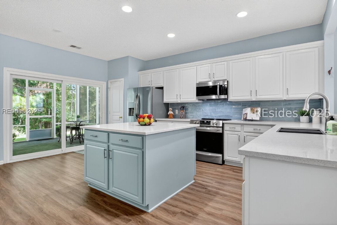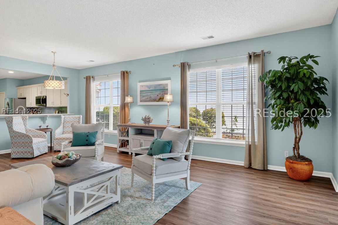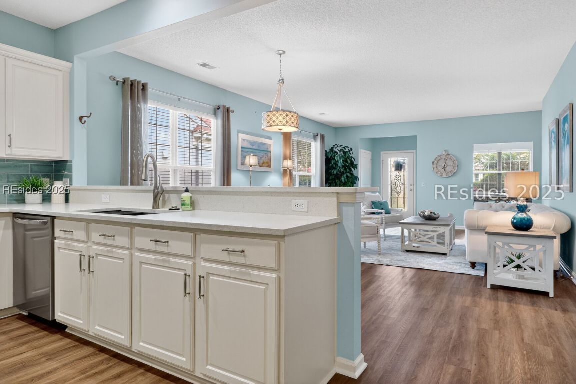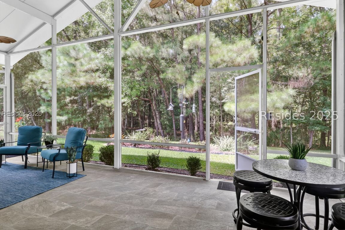 Beautifully updated, rarely seen, Teal model in Sun City Hilton Head featuring a Great rm, Carolina rm & lg office w/updated flooring, two bed, two bath, fresh int & ext paint, blinds, light fixtures, & fans. The kitchen features newer appls, countertops, sink, faucet, & painted cabinets. The primary bath has been fully renovated w/ gorgeous vanities, tile shower & floors. The guest bath is also beautifully remodeled. Enjoy the abundant closet space! The sliding glass door was replaced leading to the 12'x20' screened porch overlooking a private, wooded lot. Roof 2022, AC 2024, Leaf Filter Gutter Guards, & fresh landscaping. Move-in ready!