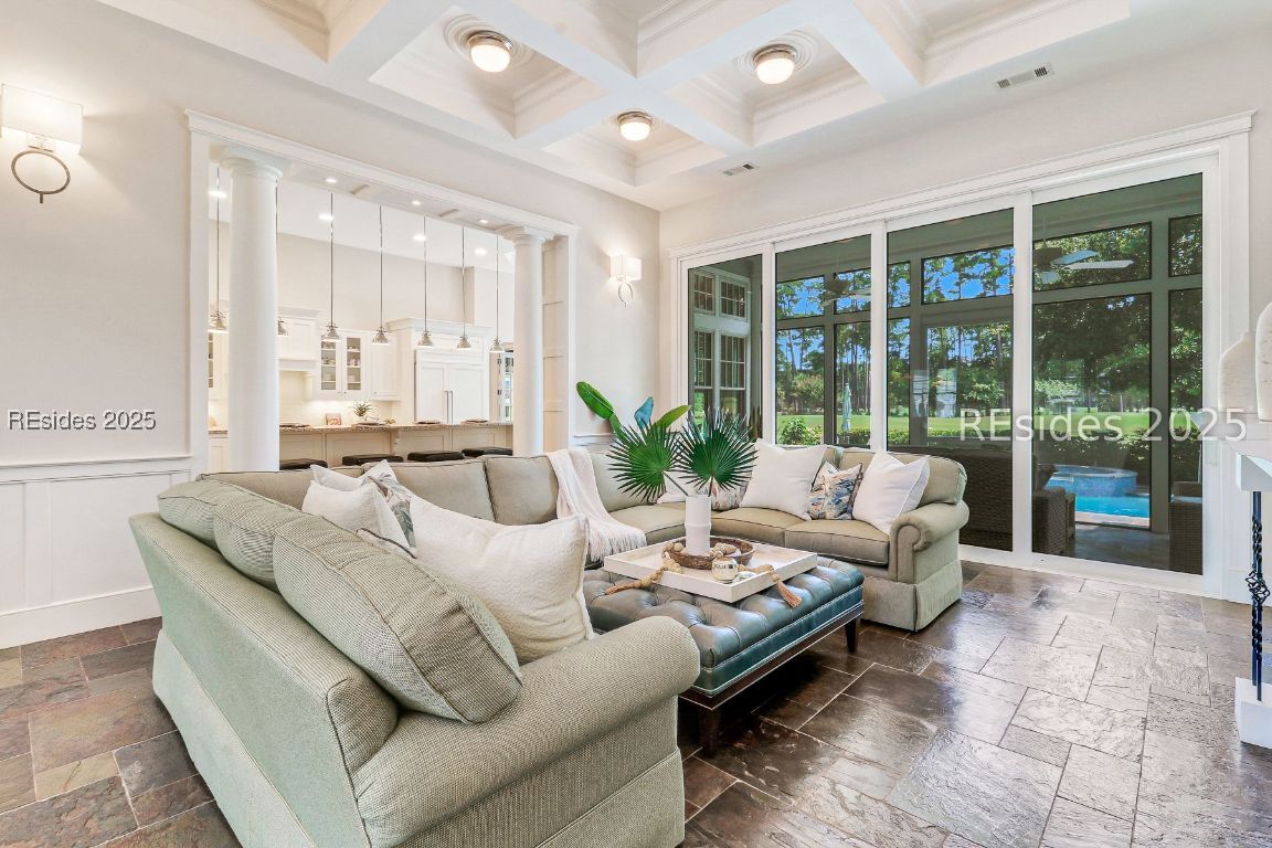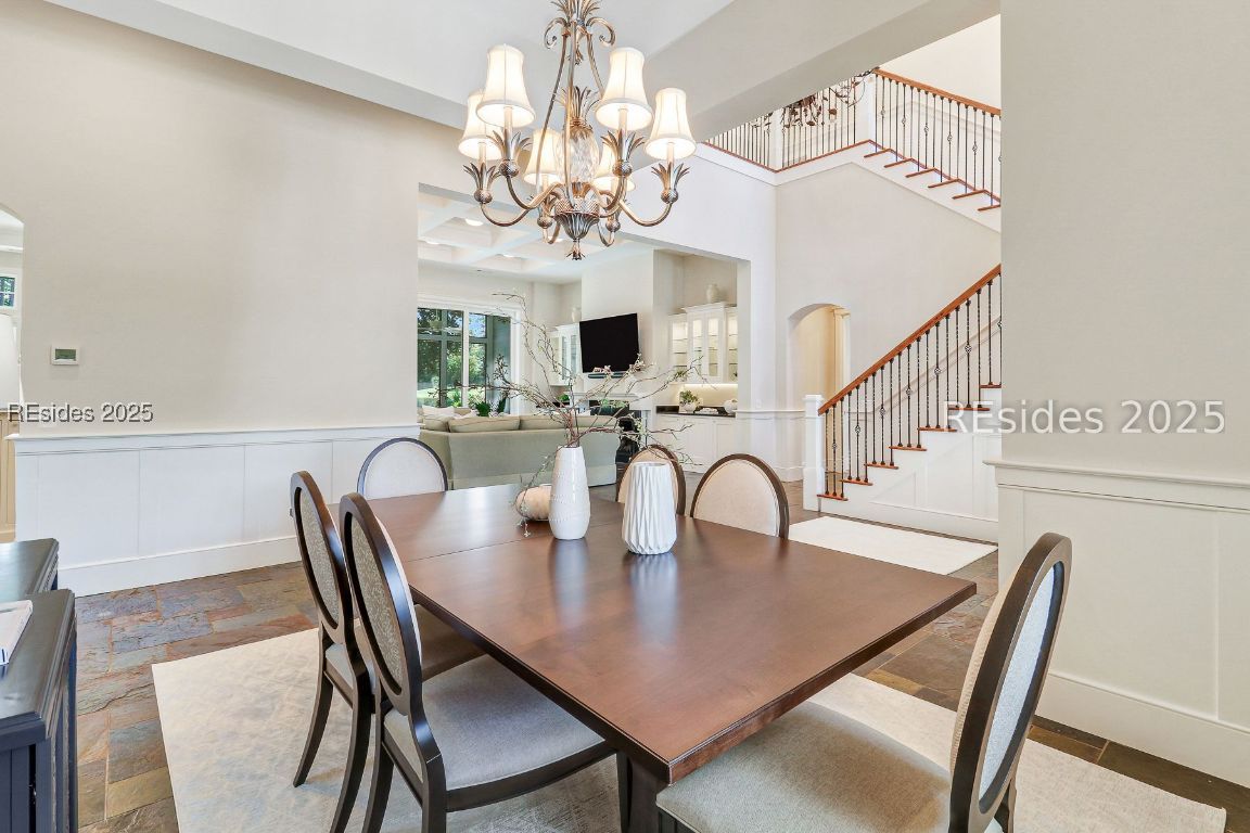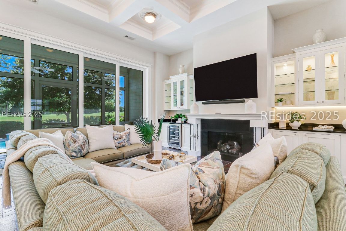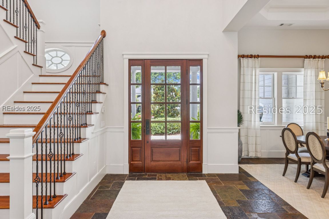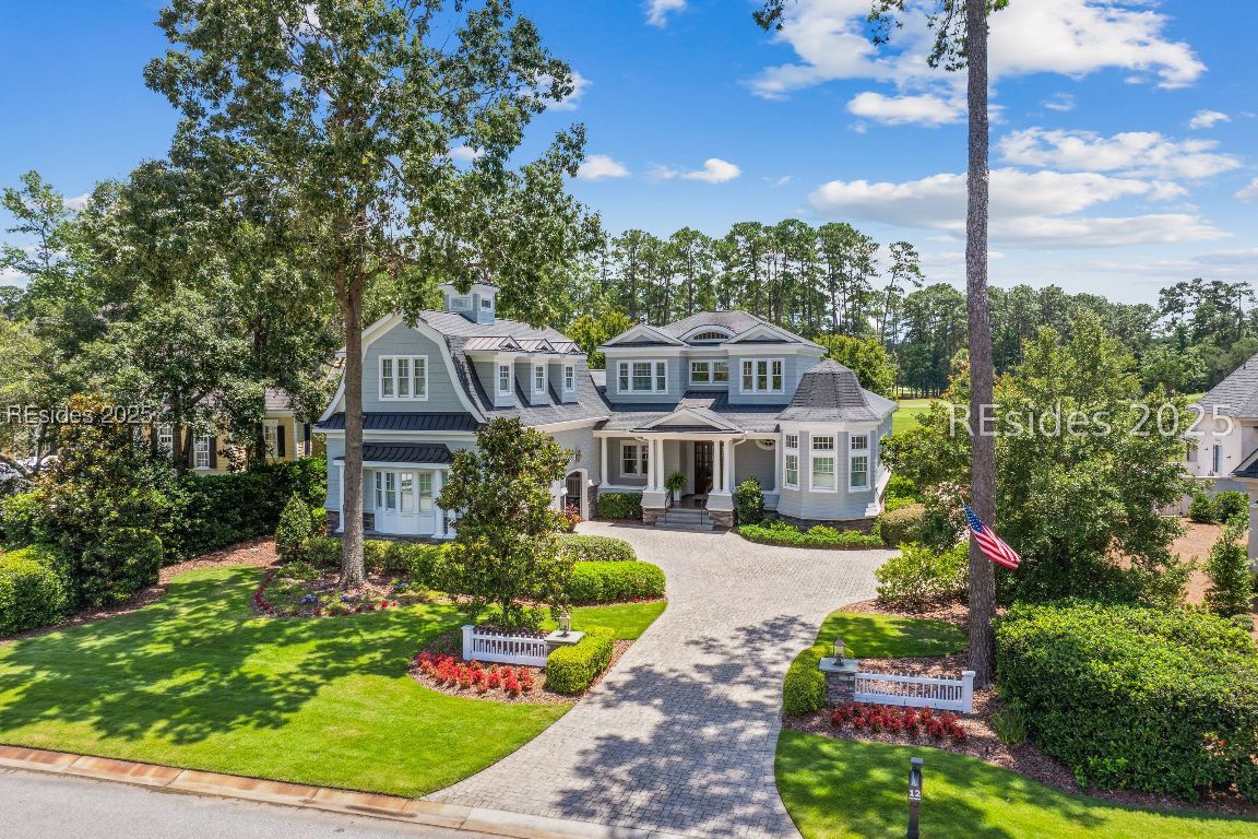 This timeless six-bedroom, five-bath Shingle-style estate blends the relaxed elegance of the Hamptons with the storied beauty of the Lowcountry in the prestigious Berkeley Hall Club. With graceful rooflines, classic dormers, and a wide front porch, the home makes a striking first impression refined, welcoming, and impeccably tailored to its surroundings. Inside, craftsmanship takes center stage. Rich slate and hardwood floors, intricate millwork, and sun-drenched interiors evoke a sense of classic coastal luxury. The main living areas are open yet intimate, flowing seamlessly from the chefs kitchen to formal and informal dining spaces, a light-filled great room, and a spacious screened porch designed for year-round enjoyment. The first-floor primary suite is a true retreat with serene lake and fairway views, a spa-inspired bath, and dual walk-in closets. Five additional guest suites offer ultimate comfort for family and guests, and the first floor office overlooking the fairways is the ideal work from home space. Step outside into your private backyard oasis: a heated saltwater pool and spa take center stage, framed by sweeping lake and golf course views that capture the tranquil essence of Berkeley Hall. Whether hosting al fresco dinner parties or relaxing under the stars, this is Lowcountry living at its finest.