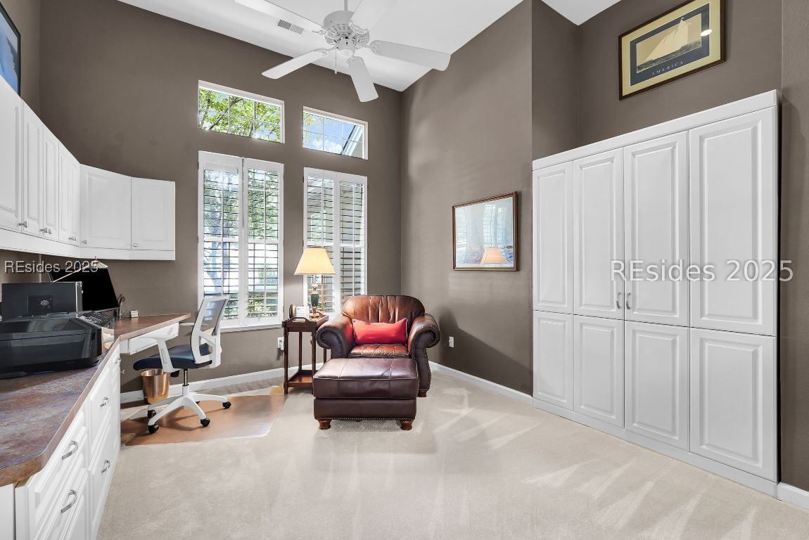 Located on a tranquil court in Sun City Hilton Head lies a rare and refined Del Webb Marion Webster Estate Model-a one story home showcasing soaring 12 foot ceilings and is enveloped by a serene wooded view. The expansive layout encompasses 2 bedrooms, 2.5 bathrooms and includes a versatile den/office/library thoughtfully equipped with a Murphy bed, offering the option of a third bedroom. This home includes two living rooms, one is equipped with built ins and a cozy fireplace. Other upgrades include a new A/C, two car garage PLUS golf cart garage, a spacious primary suite w/a closet equipped with custom shelving & an expanded screen lanai which is the perfect space to unwind while admiring views of the water fountain and secluded woods. There are too many upgrades to list, this home is a must see!
