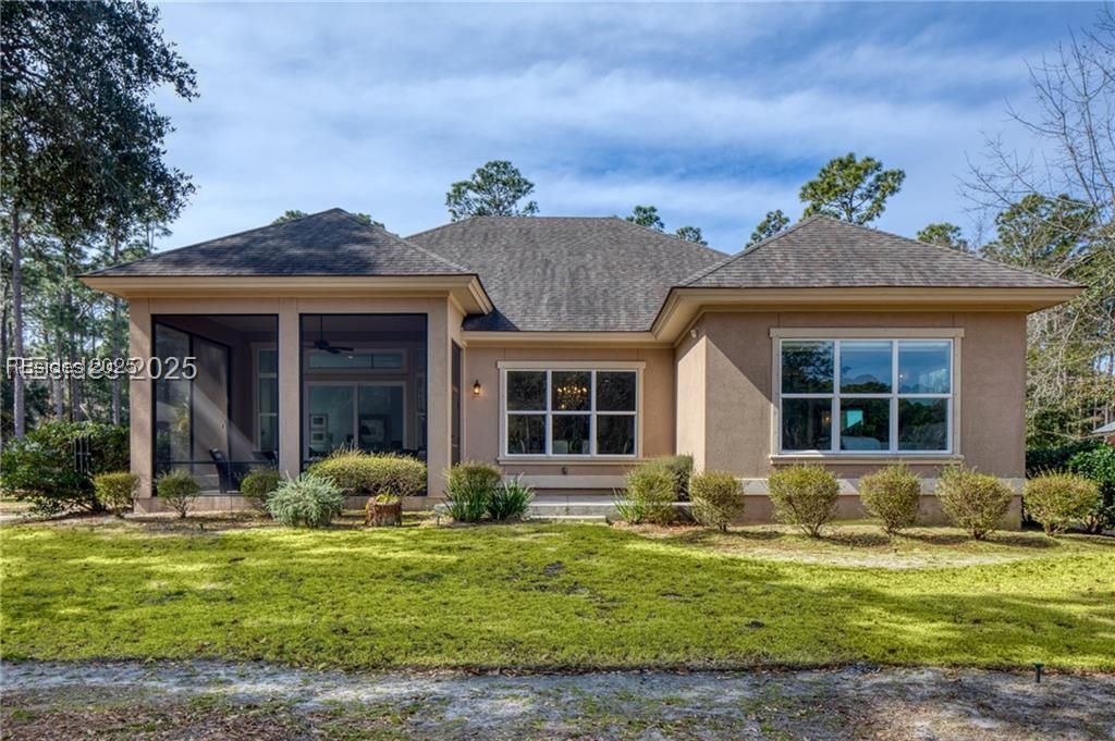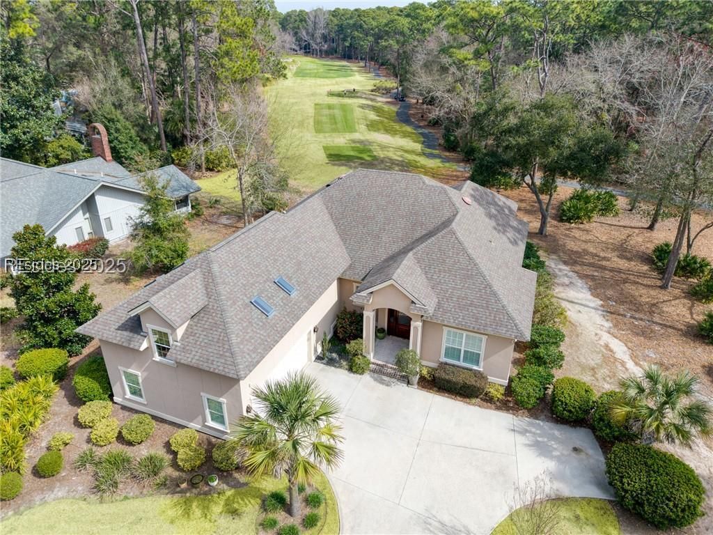 This luxurious, 2016-built, one-owner, turn-key, 4 bd/4 bath open-concept home offers maximum privacy on a premium lot surrounded by lush, professionally-designed landscaping and featuring panoramic views of the first green and two fairways of Oyster Reef Golf Club. Walking through the magnificent mahogany front door and into the grand foyer graced by an 8-stem Waterford crystal chandelier, you are greeted by soaring 12 ceilings in the Great Room accented by crown molding, custom woodwork, and an elegant floor-to-ceiling tumbled marble stone and linear fireplace. Natural light cascades into the Great Room and the window-scaping captures 180-degree views of the golf course, trees and birds. The Chefs kitchen, with its customized cabinetry, accent lighting and stainless-steel appliances includes a Fisher & Paykal professional 5 burner gas stove and ceramic oven, is also bathed in abundant natural light and it, too, affords panoramic views of the golf course. The adjoining and elegant dining room features mood lighting, crown molding and custom woodwork for formal dining. Alternatively, you can retreat to the spacious, screened Lanai for more casual, relaxed entertaining. There are 3 first-floor en suite bedrooms all with walk-in closets and a laundry room with custom cabinets, sink and pantry. The primary en suite emphasizes privacy and luxury with a tray ceiling, Waterford crystal sconces, crown molding, walk-in closet and a stunning incomparable spa-like bathroom retreat. The 600 square-foot upstairs en suite with its two custom cabinetry desks, numerous lateral filing drawers, built-in wall cabinets and storage offers uncompromising space not only for working at home but with the option to convert to a bedroom or man cave. The large attic space offers cost-savings with its blown-in foam insulation and large storage capacity. The HVAC system promotes comfort, cleanliness, and energy cost efficiency with its whole-house air purification and dehumidifying systems, a 2016 Carrier unit, a 2024 Amana 17.2 SEER2 2.5-ton variable speed inverter and 2024 Goodman unit equipped with Smart technology. The lighting has been fully converted to LED with the ceiling lights, chandeliers, sconces and pendant lights equipped with dimmer switches. The large two-car garage easily accommodates two big SUVs, a refrigerator, freezer, storage racks and shelving. This home is located in a no-flood zone which offers better insurance affordability.