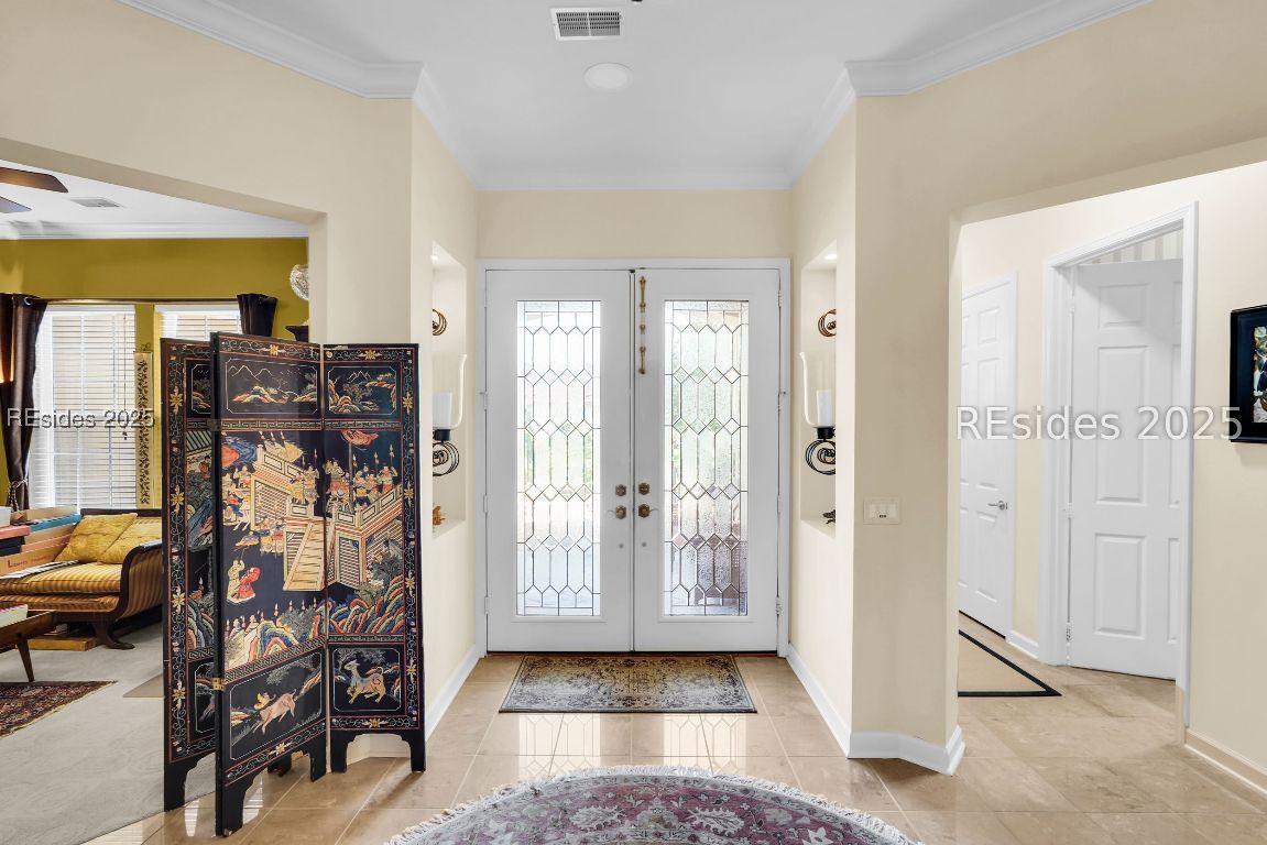 Lowcountry living amplified in this exquisite, rarely available Yellowstone model - one of Sun Citys most sought-after designs! This beautifully appointed 2800 sq ft. 2 Bedroom, 2.5 Bath home with an additional Office/Den, 3-car garage plus climatized workspace is perfectly positioned near the end of a quiet cul-de-sac road in the exclusive Estates section of Sun City. Enjoy sweeping, panoramic, magnificent lagoon views from your climatized Carolina room, bringing wildlife and natural beauty right to your doorstep. Mature, vibrant landscaping and hardscapes, newly sodded lawn, and majestic palm, lead to a spacious front courtyard with a charming fountain and custom iron railings! Embrace luxury as you enter the grand foyer with soaring 10-12 foot ceilings throughout complimented by timeless and elegant marble flooring. The spacious Great Room showcases custom built-ins, an impressive gas-log fireplace, and a bonus bar area off great room with plumbing for a sink - all accented by refined crown molding and stylish finishes throughout. Newly installed 8 inch LEDs throughout on smooth ceilings, a new 50-year roof, tinted windows, new whole home water filtration system, clean stucco inspection, and just painted exterior with 3 Coats high value Sherwin Williams paint make this home seem new! New garage doors, smart, wireless openers, wireless smart thermostats, new upgraded ceiling fans, and upgraded HVAC just add to this incredible list of owner investments and upgrades. The roomy, open, kitchen offers a generous breakfast area, bar seating, ample pantry space, and quality finishes that make both daily living and entertaining a joy. Two large en suite bedrooms provide comfort and privacy, with the luxurious primary suite offering picture-perfect lagoon views and a spa-inspired bath. The convenient side, covered porch area off kitchen provides the perfect outdoor cooking location to grill, smoke, griddle and chill! This exceptional home accelerates comfort and class in the Estate section- one of the best locations in Sun City making it an exceptional opportunity you don't want to miss!