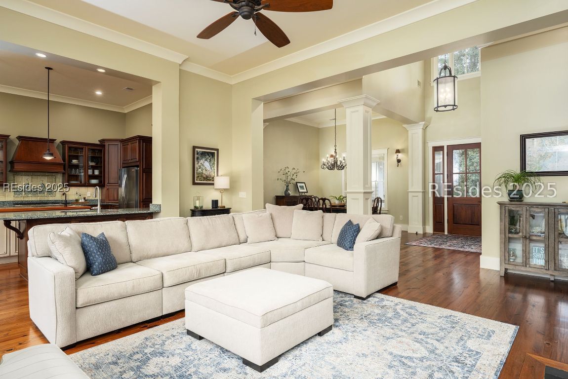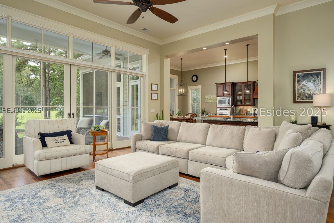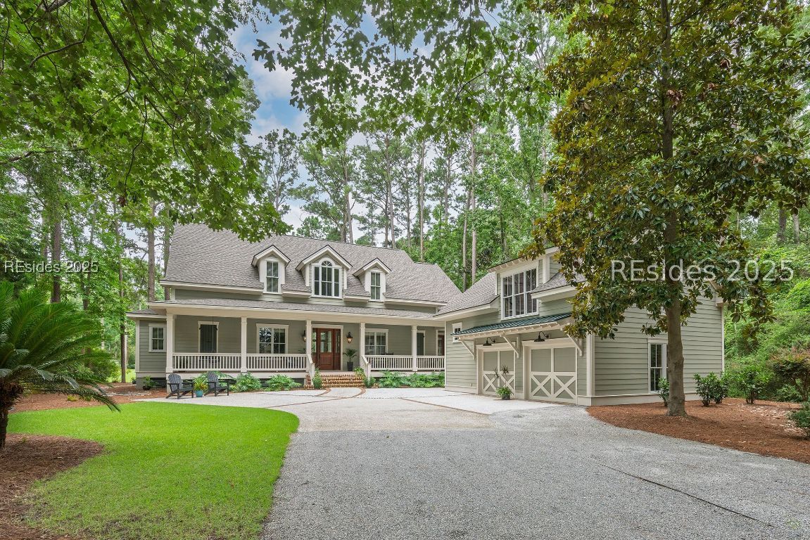 Situated on a beautiful lot with a peaceful golf/pond view, this classic Lowcountry style custom home built by Steve Tilton (Coastal Signature Homes) features soaring 12 ft. ceilings throughout the entire first floor, elaborate molding trim package, granite kitchen counters, kitchen island with prep sink, oversized walk in pantry, Pella windows, Baldwin hardware, and incredible storage throughout. Enjoy outdoor living at its finest, with covered porches at the front and rear of the home, a gorgeous screened porch w/gas fireplace, and a new paver patio. A large 2 car garage with golf cart bay and unfinished space above for future use completes this attractive residence. Impeccably maintained, recent upgrades include new roof, new HVAC units, freshly painted exterior and mahogany exterior doors. Private gated Island Community offers Clubhouse, River Club, fitness center, 2 pools, kayak dock. Six Tennis courts, pickleball courts, Bocce courts, Dog park, 27 hole Golf course & 24/7 gated security.