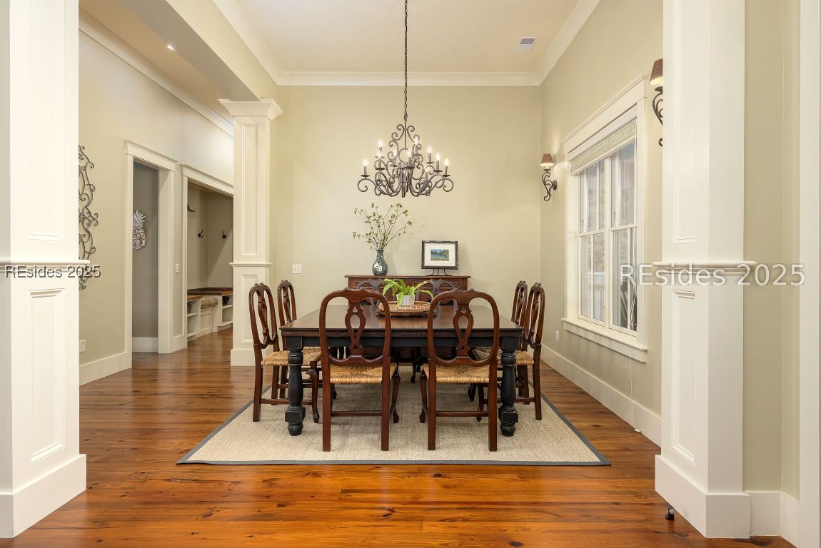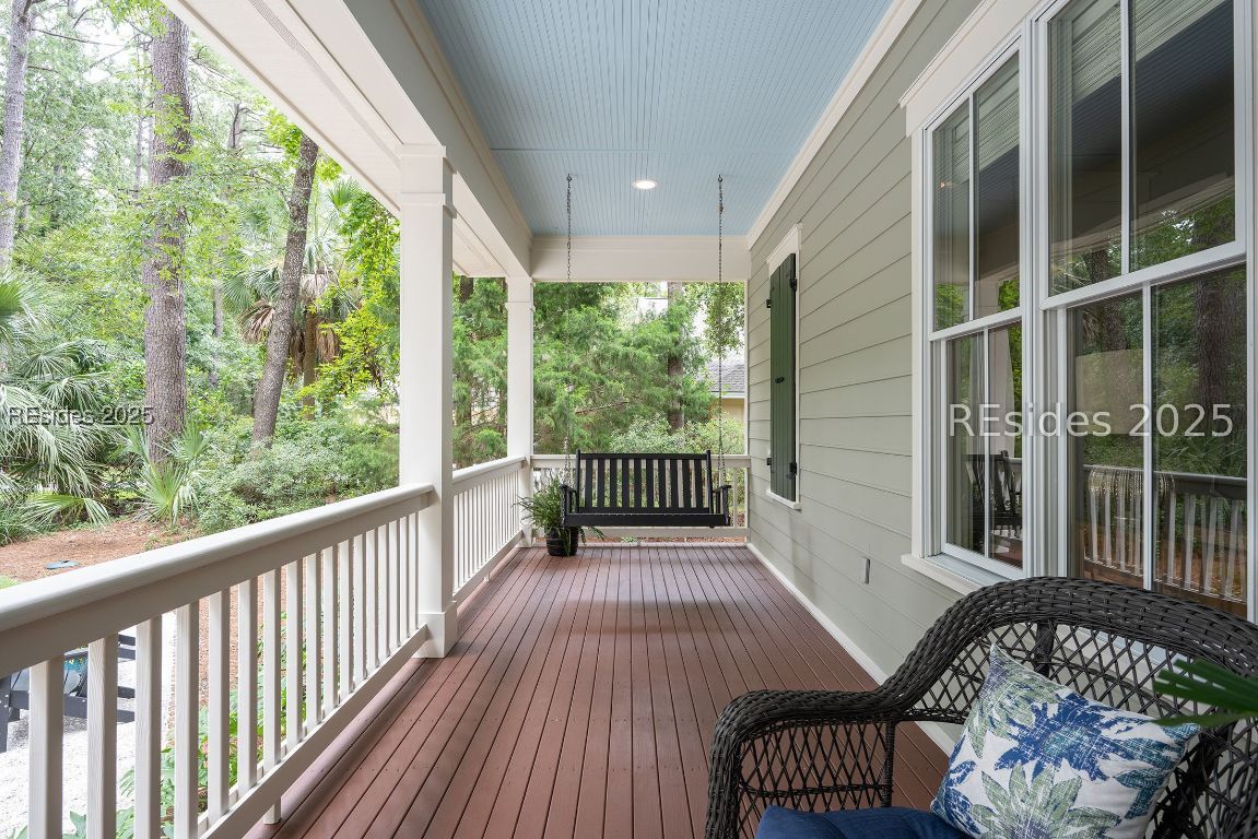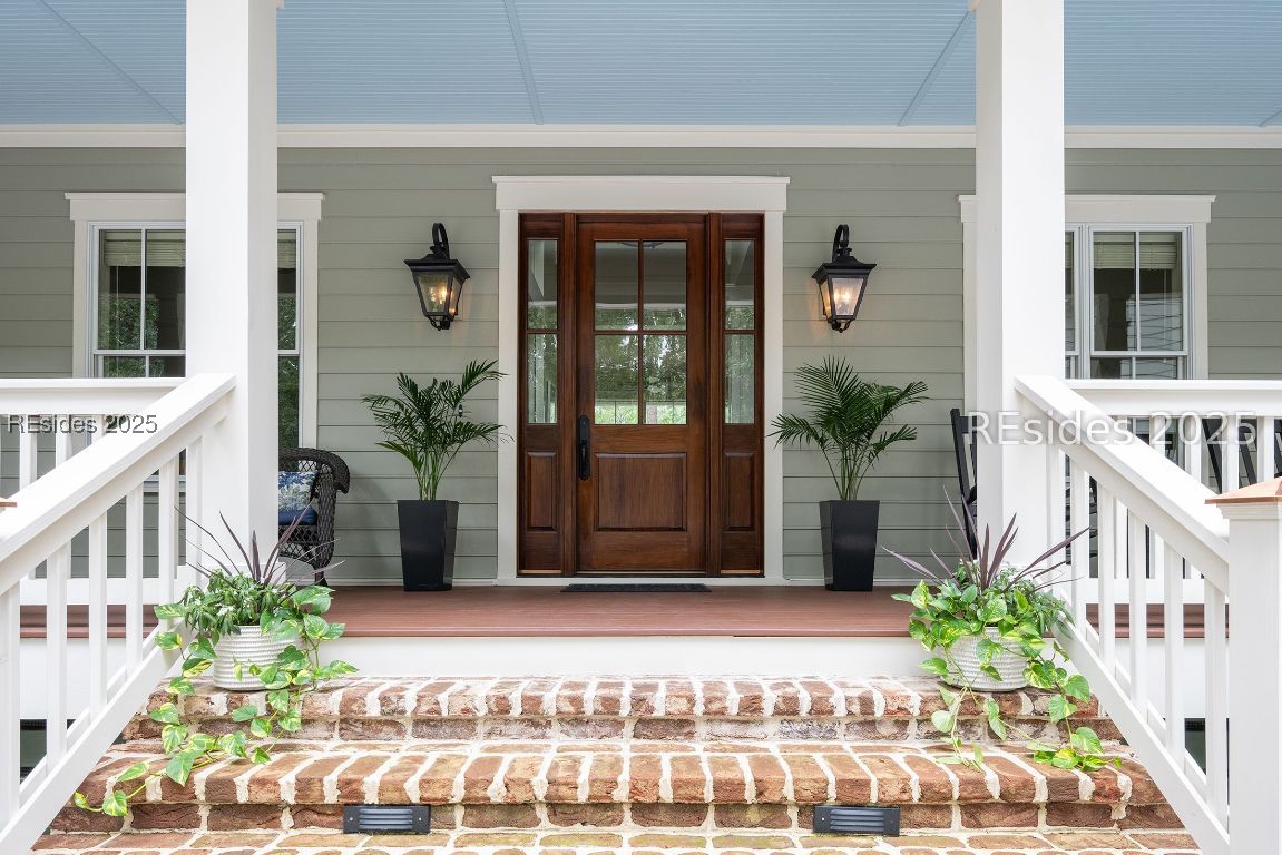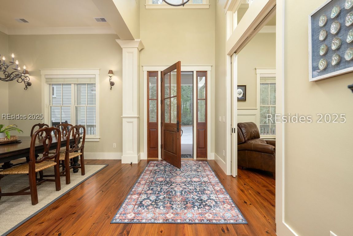 Situated on a beautiful lot with a peaceful golf/pond view, this classic Lowcountry style custom home built by Steve Tilton (Coastal Signature Homes) features soaring 12 ft. ceilings throughout the entire first floor, elaborate molding trim package, granite kitchen counters, kitchen island with prep sink, oversized walk in pantry, Pella windows, Baldwin hardware, and incredible storage throughout. Enjoy outdoor living at its finest, with covered porches at the front and rear of the home, a gorgeous screened porch w/gas fireplace, and a new paver patio. A large 2 car garage with golf cart bay and unfinished space above for future use completes this attractive residence. Impeccably maintained, recent upgrades include new roof, new HVAC units, freshly painted exterior and mahogany exterior doors. Private gated Island Community offers Clubhouse, River Club, fitness center, 2 pools, kayak dock. Six Tennis courts, pickleball courts, Bocce courts, Dog park, 27 hole Golf course & 24/7 gated security.