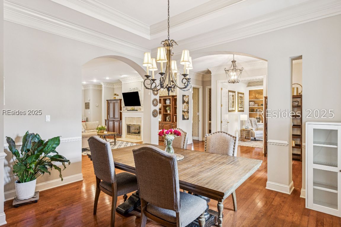 Live Luxuriously in *Literally* the former Toll Brothers model home, where timeless elegance meets effortless Lowcountry living. Perfectly situated on a quiet cul-de-sac in prestigious Hampton Hall, this 3-bedroom, 2.5-bath single-story residence offers refined craftsmanship and thoughtful design - plus an office/den, screened lanai, and oversized 2-car garage. From the moment you step inside, you'll be greeted by soaring 10-foot ceilings, 8-foot doors, rich crown molding, and gleaming hardwood floors that flow throughout the living areas. The expansive great room is anchored by a cozy fireplace and built-in cabinetry ideal for relaxing or entertaining. A light-filled formal dining room and den/home office with built-ins add style and flexibility. The gourmet kitchen is a chef's dream, featuring a large center island, bright breakfast nook, stainless steel appliances, and plentiful cabinetry -perfect for hosting or enjoying quiet mornings. Retreat to the oversized primary suite with spa-like ensuite bath, and a generous walk-in closet. Two well-appointed guest bedrooms include special touches like a charming custom window seat. Step out to the screened lanai and take in tranquil peekaboo views of the 1st tee, complemented by a low-maintenance yard- peaceful retreat after a round of golf or a day enjoying resort-style community amenities. This meticulously maintained home boasts a 2024 roof, 2017 HVAC system, newer water heater, and updated appliances offering modern comfort and peace of mind. Just a short stroll to Hampton Hall's world-class amenities including indoor and outdoor pools, tennis and pickleball courts, a Pete Dye golf course, fitness center, clubhouse dining, and miles of scenic walking trails. Don't miss this rare opportunity to own a move-in ready, high-end model home in one of Bluffton's most desirable communities.