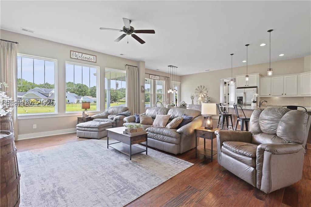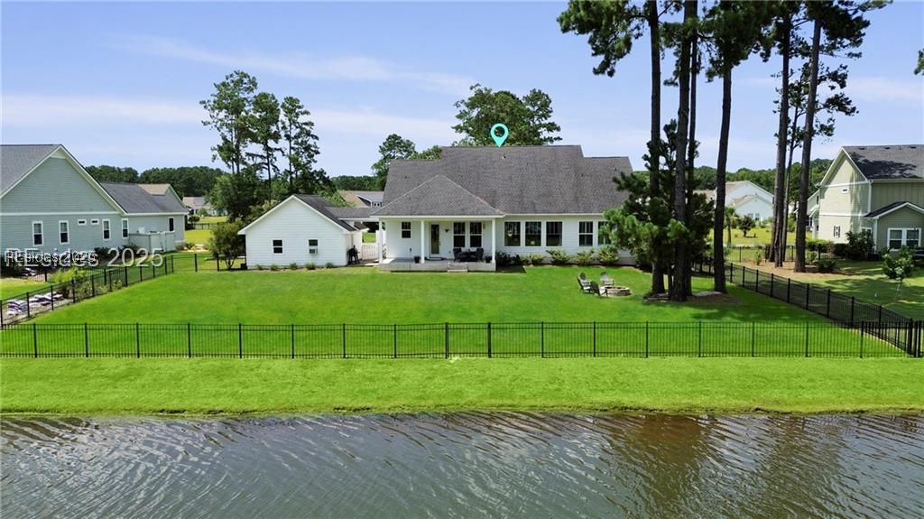 MOVE IN READY! Welcome to 20 Daffodil Farm Way, a beautifully maintained 3-bedroom, 2.5-bath ranch-style home offering 2,351 sq ft of thoughtfully designed single-level living in the sought-after gated community of May River Preserve. Built by David Weekley Homes and situated on over half an acre, this home combines comfort, function, and serene lagoon views to create the perfect Lowcountry retreat.Inside, you'll find a light-filled open-concept layout with a combination of wood, tile, and carpet flooring throughout. The spacious kitchen features a gas cooktop, stainless steel appliances, ample storage, and a generous island ideal for casual dining and entertaining. Plantation shutters throughout add timeless charm while enhancing privacy and natural light. The primary suite is a true retreat, featuring a tray ceiling, a large walk-in closet, and a bathroom with dual vanities and a zero-entry walk-in shower. Two additional bedrooms share a well-appointed full bath, and a separate powder room is available for guests. Step outside to enjoy the covered back porch overlooking the fenced backyard and tranquil lagoon, perfect for relaxing evenings or weekend gatherings. While the yard is low-maintenance, the lagoon views steal the show and provide a peaceful backdrop year-round. The home also includes a spacious 2-car garage. May River Preserve offers low HOA fees and access to a community pool, with plenty of room to enjoy the outdoors in this golf cart-friendly neighborhood. Ideally located just minutes from New Riverside Village for shopping and dining, and a short drive to Old Town Bluffton, Savannah, and Beaufort, this home delivers the lifestyle you've been looking for.