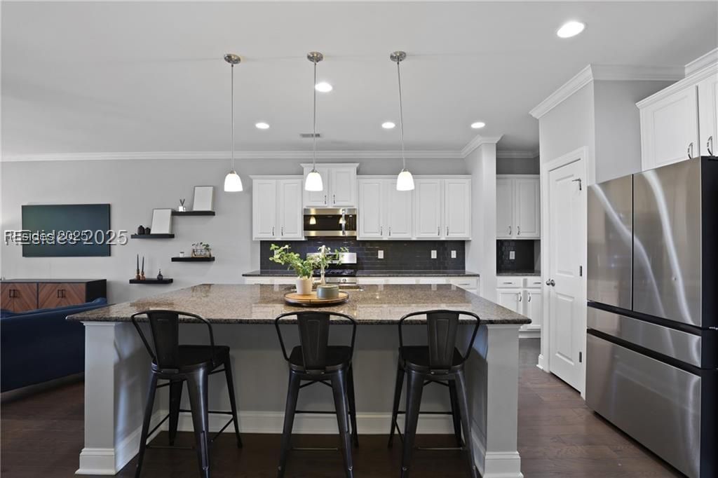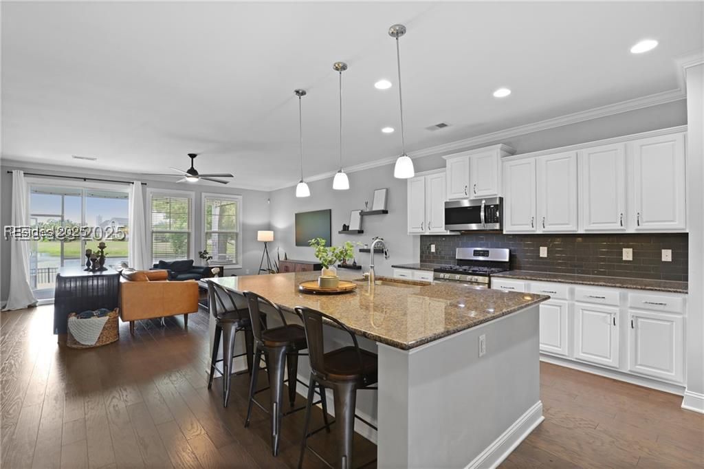 Highly sought-after 5-bedroom Tillman model, complete with a charming covered front porch & ideally located just a short stroll from the resort-style amenities. Showcasing stylish coastal-inspired colors throughout. The main floor features a spacious owner’s suite, a formal dining room that doubles as a flex space, & a beautifully appointed kitchen with a gas stove, granite countertops, & a convenient butler’s pantry. Upstairs, generously sized bedrooms, sprawling loft, & balcony. Unwind & take in the serene Lowcountry setting from the screened lanai or the upgraded patio-breathtaking views of peaceful lagoons and a lush, wooded tree line.
