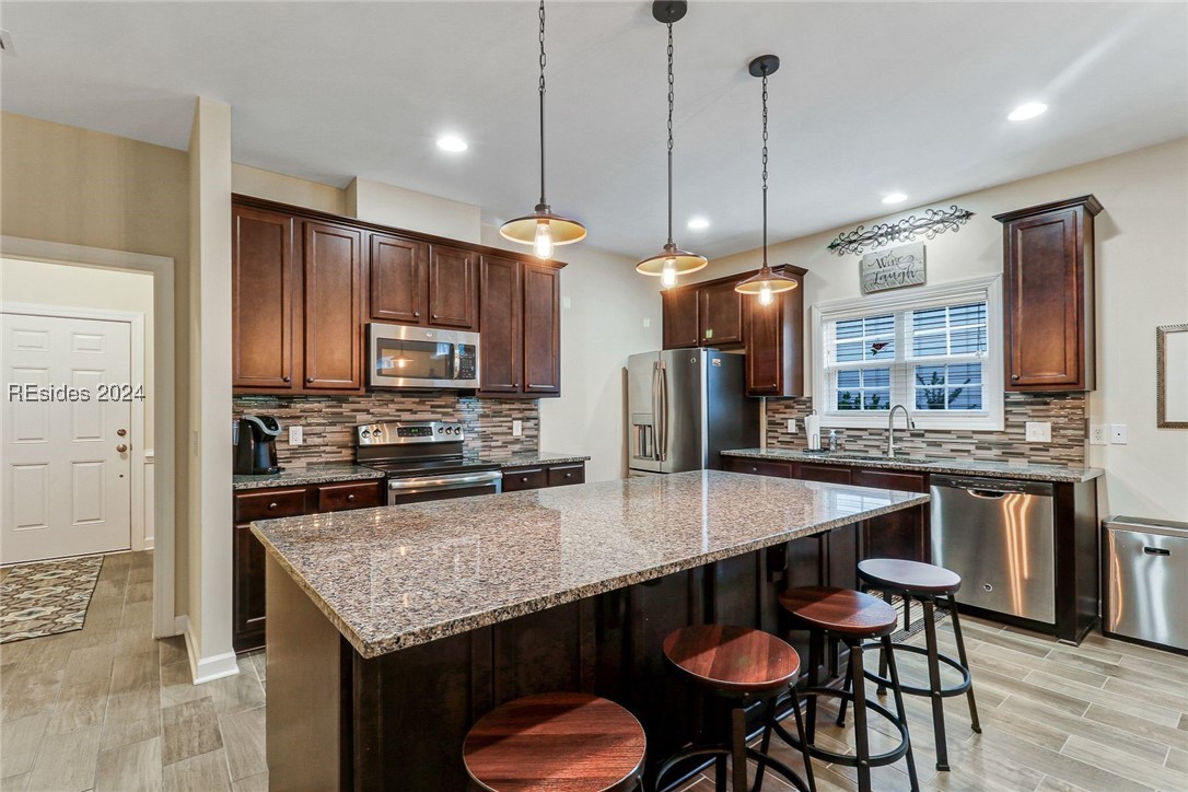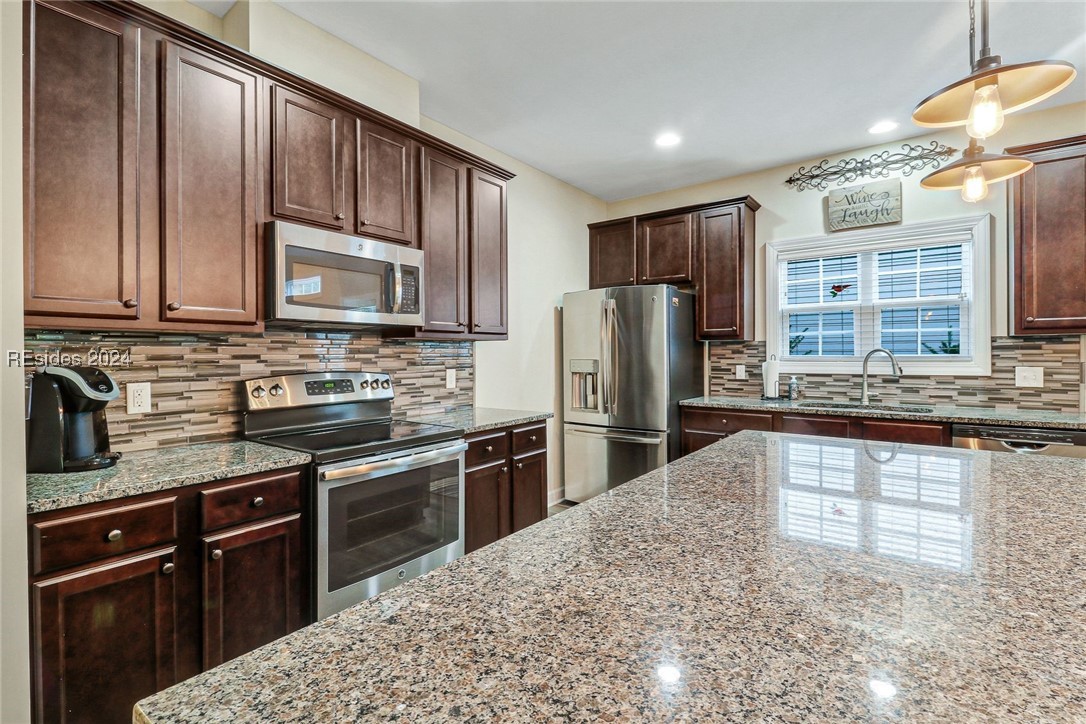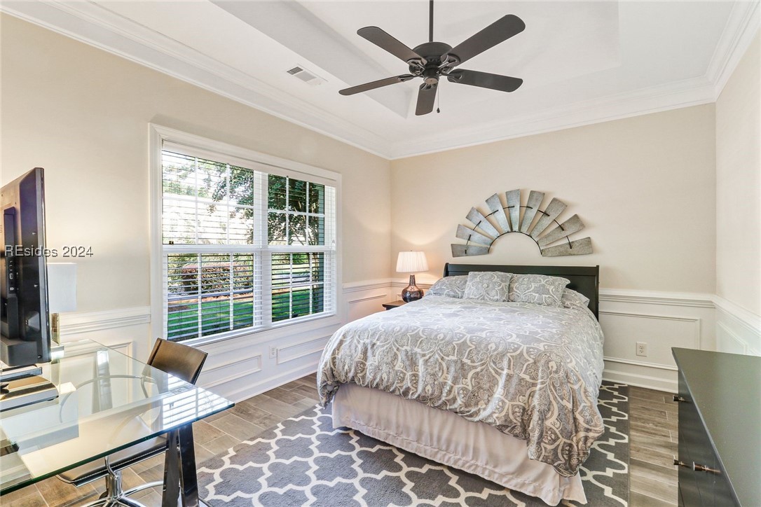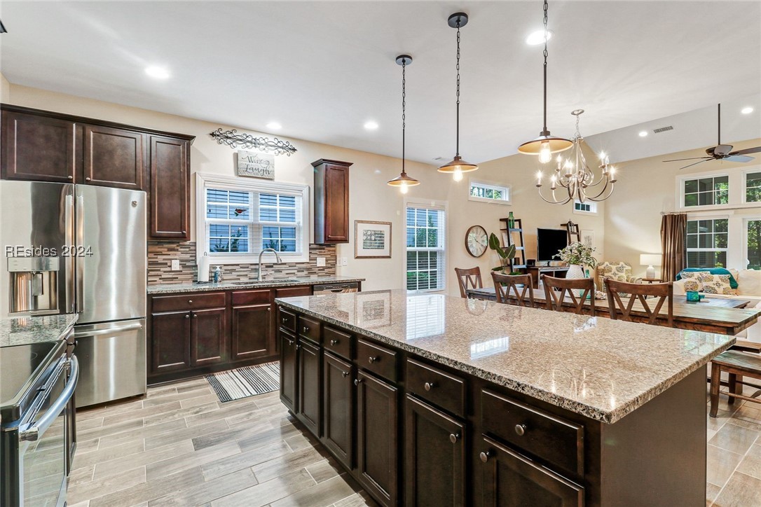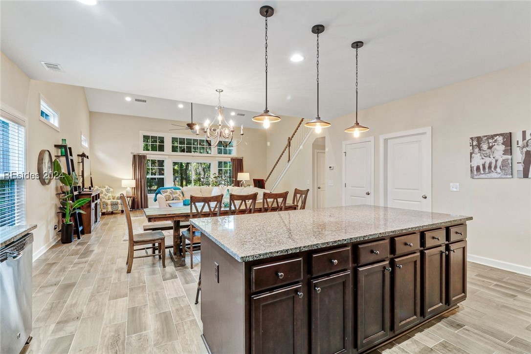 This stunning home features a primary bedroom on the first floor, two generously sized guest bedrooms upstairs, and a versatile room on the main level that can serve as a 4th bedroom or office. The open-concept design features a living room with soaring two-story ceilings, creating a bright and airy feel. Upstairs, you'll find a large loft perfect for extra living space, and an oversized attic for all your storage needs. Outdoors, relax in the screened patio with an extended slab, perfect for entertaining. The shaded backyard, surrounded by trees and natural growth, provides a cool retreat during Lowcountry summers.