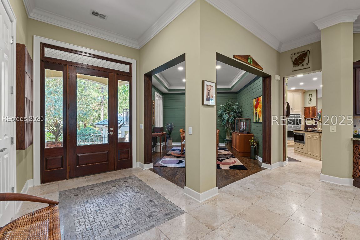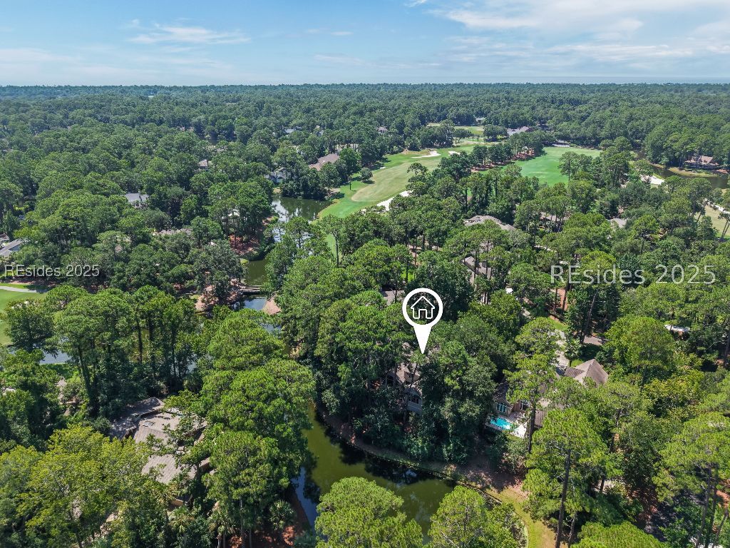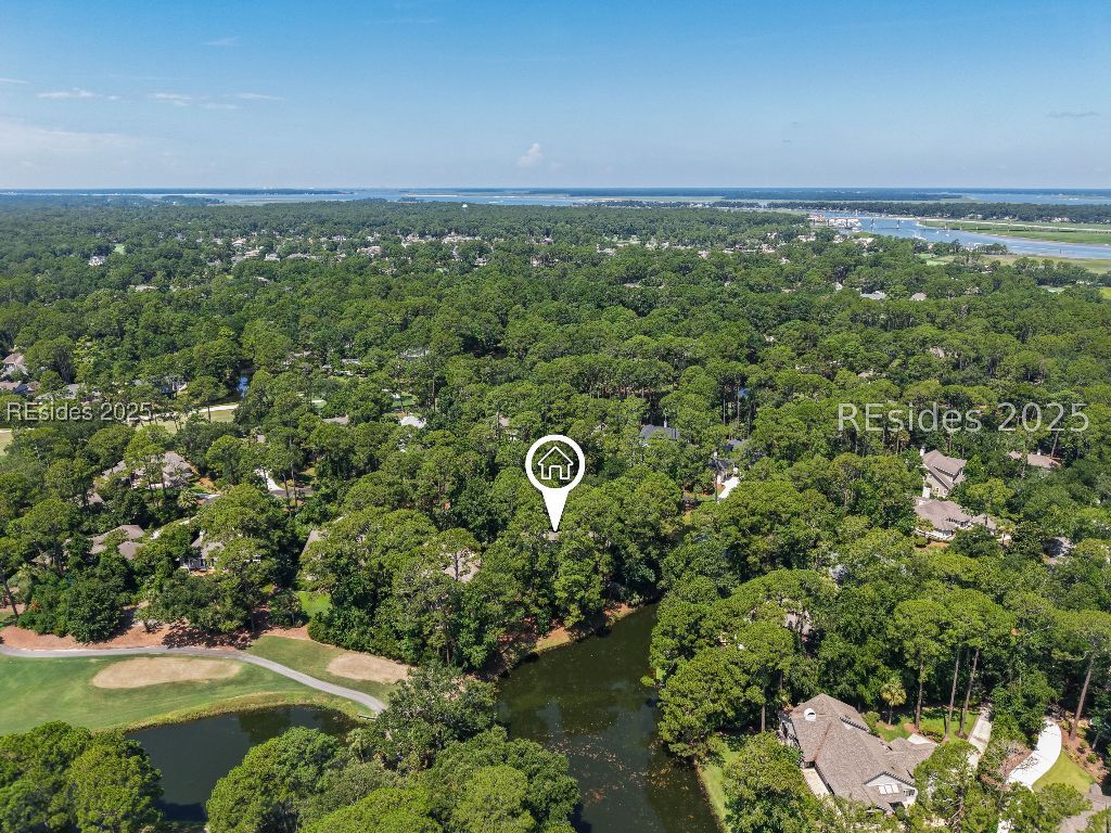 Beautiful custom home on a large cul-de-sac homesite in Long Cove, a highly sought-after community with a private 18-hole championship golf course. Enjoy panoramic lagoon-to-golf views from the open deck, complete with a mosquito misting system and built-in outdoor grill perfect for entertaining or enjoying dinner outdoors. This elegant home features travertine and hardwood floors, granite countertops, top-tier stainless steel appliances, and a center island in the kitchen. Vaulted ceilings enhance the spacious living and family rooms. A wet bar with lighted cabinets and a wine cooler adds to the homes entertaining appeal. The primary suite offers stunning views, a large bath with walk-in shower, and custom closets. Two guest bedrooms are located on the main level, including one in a private split layout. A full guest suite upstairs is ideal for visitors or extended stays.