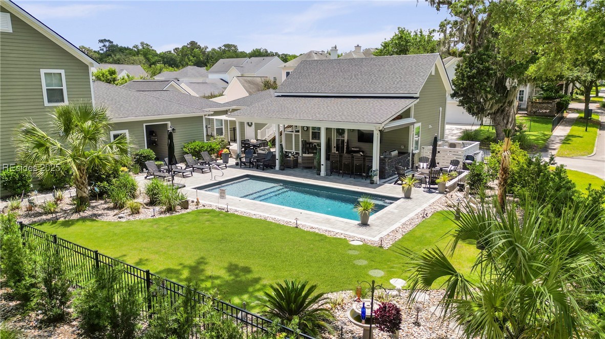 Southern charm and elegance in this beautifully upgraded home, nestled within a quaint waterfront community. From the moment you arrive, you'll feel the casual, yet refined, lifestyle. Designed for entertaining, the backyard is nothing short of a first-class oasis. Whether hosting lively gatherings or enjoying a peaceful retreat, this space has it all—an inground pool, a custom outdoor kitchen and bar, a spacious guest pool house, and a lush grassy area perfect for lawn games. Above the pool house, a climate-controlled unfinished room awaits your vision—transform it into a private studio, gym, or additional living space.