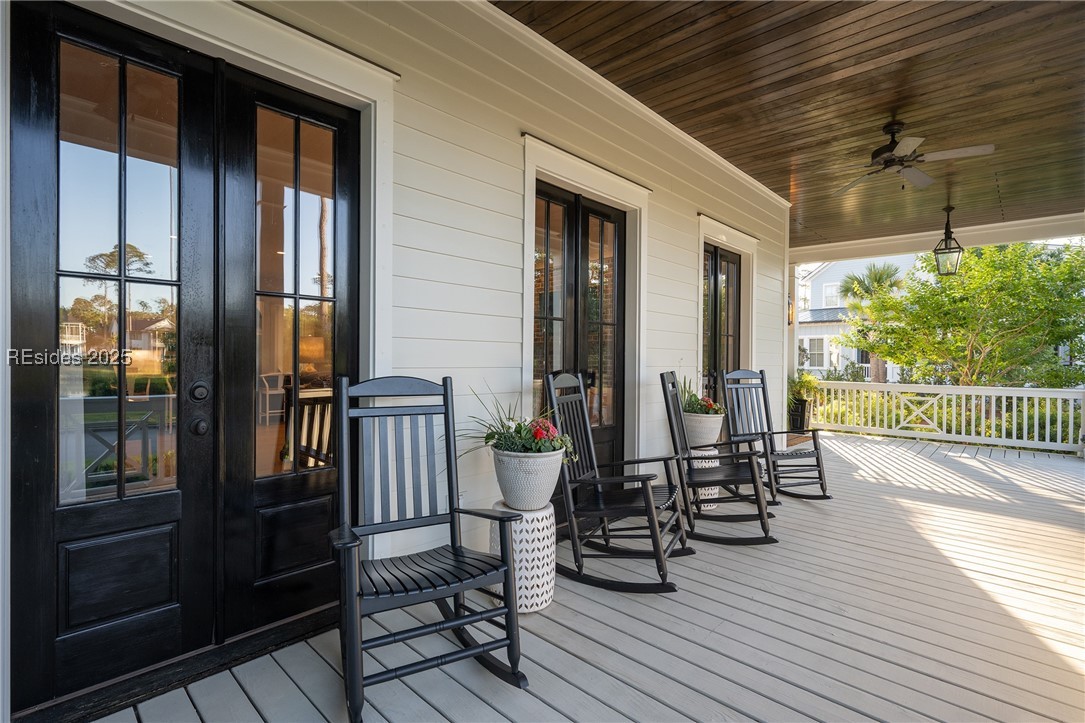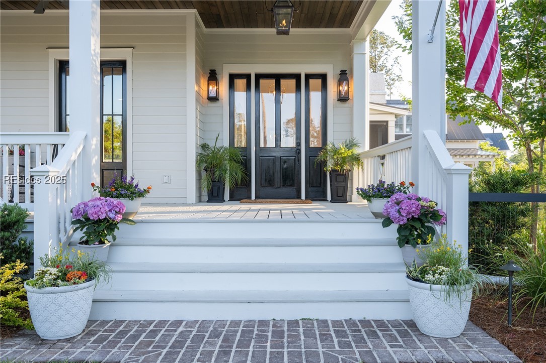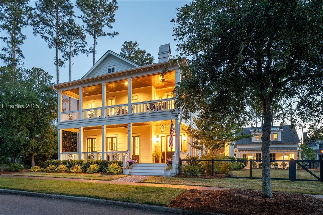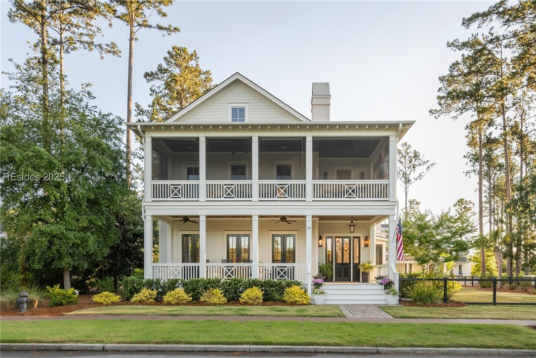 28 Yearling Road is a 5-bed, 4.5-bath Lowcountry style home with dual porches looking out over lake views. Its 3,840 square feet seamlessly blends indoor/outdoor living with an open great room with a brick hearth fireplace flanked by a grand kitchen with quartz countertops, a gas range & paneled fridge along with the screened porch with fireplace & sweeping views from the lake into the garden. The ground floor primary suite has walk-in closets & a roomy bath with soaking tub & walk-in shower. Along with the carriage house & whole home generator, 2 upstairs bedrooms and a flex space with balcony access offers plenty of room for family.