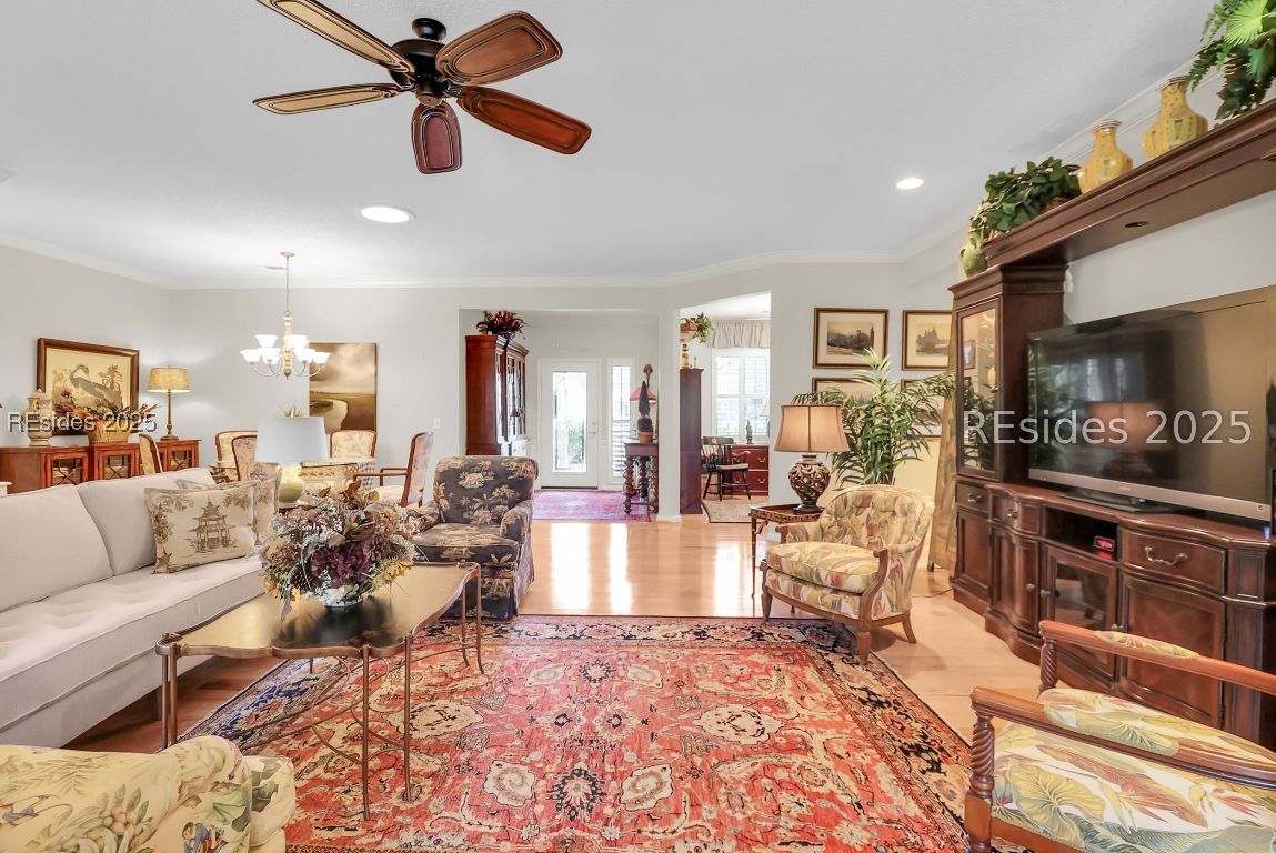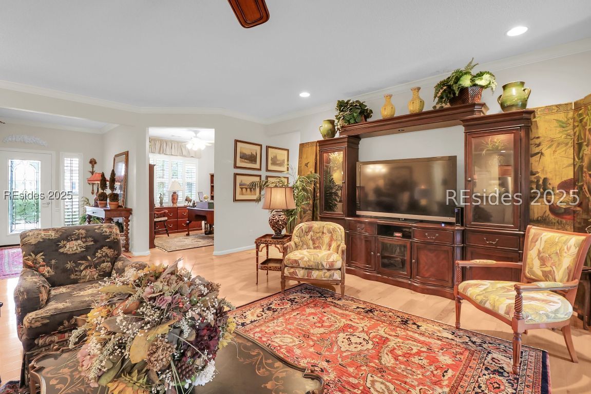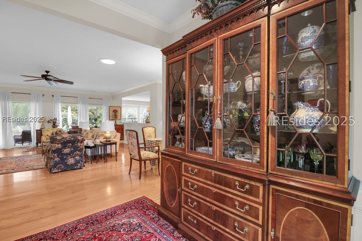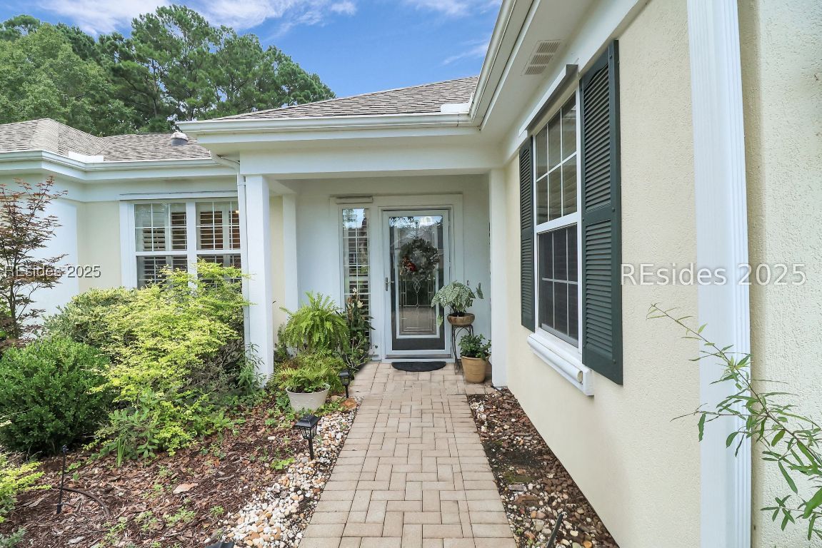 This popular Dogwood floor plan is situated on a spacious lot with a wooded backdrop, conveniently located near the Hidden Cypress Clubhouse amenities. The inviting brick paver walkway leads to a welcoming etched glass front door with a sidelight, opening into an entry foyer adorned with crown molding, chair rail, and 18" tile flooring. The Great Room, featuring crown molding, recessed lights, and wood floors, includes a formal dining area as well. The eat-in kitchen boasts a bay window where you can enjoy your morning coffee while overlooking the serene backyard. Maple-colored cabinets, some with lower roll-outs, a tile backsplash, quartz countertops with a breakfast bar, prep island, and pantry complete the kitchen. Adjacent to the entry foyer, the den/office is equipped with a lighted ceiling fan, plantation shutters, and a nook which is perfect for a desk. A separate guest area offers added privacy with a full bath. The primary suite features a bay window, soaking tub, and dual vanities. Three sliders open to a screen porch and an extended tiled patio, ideal for relaxing and enjoying the beautifully landscaped yard. The laundry room, with abundant cabinetry and a washer and dryer, leads to the two-car garage, which includes pull-down attic access and a utility sink. This home is offered at a fabulous price and is located in the active adult community of Sun City Hilton Head.