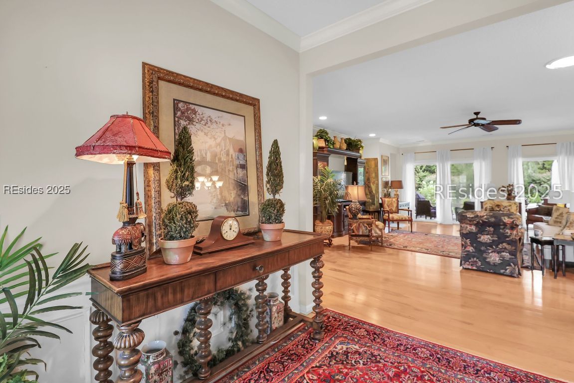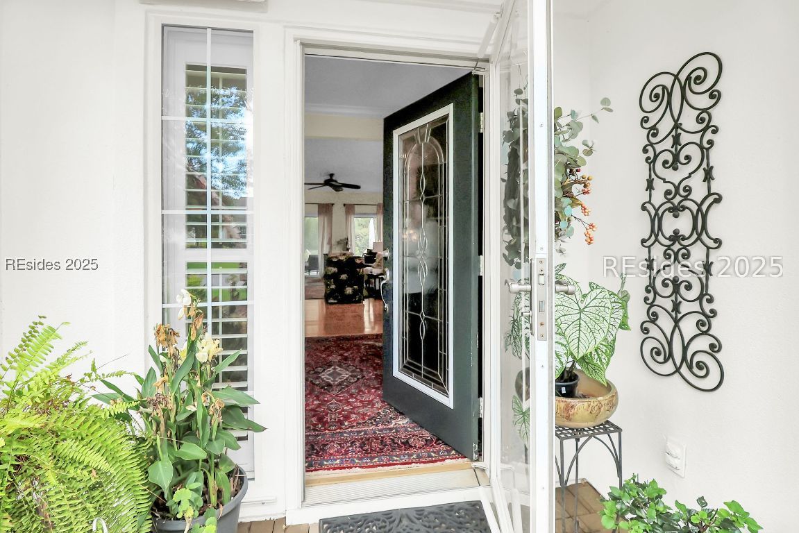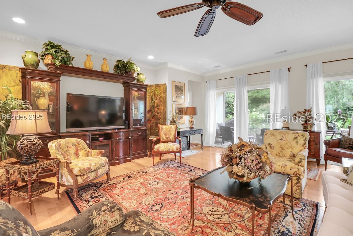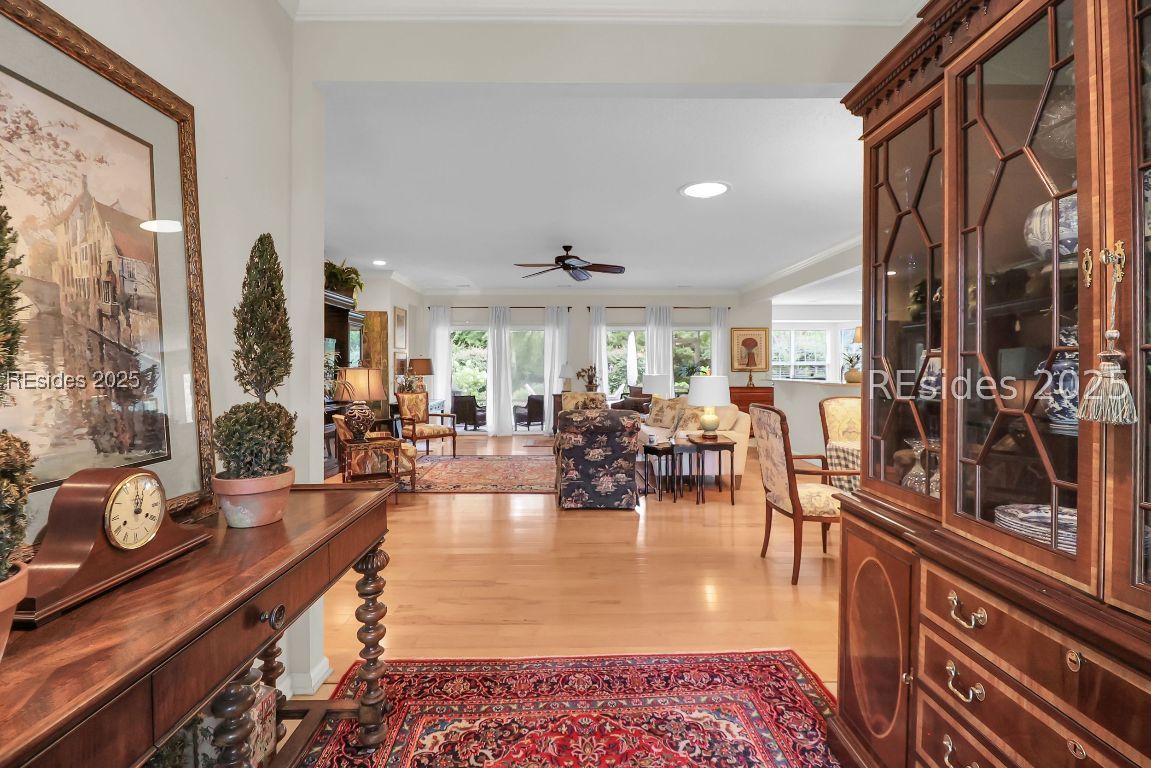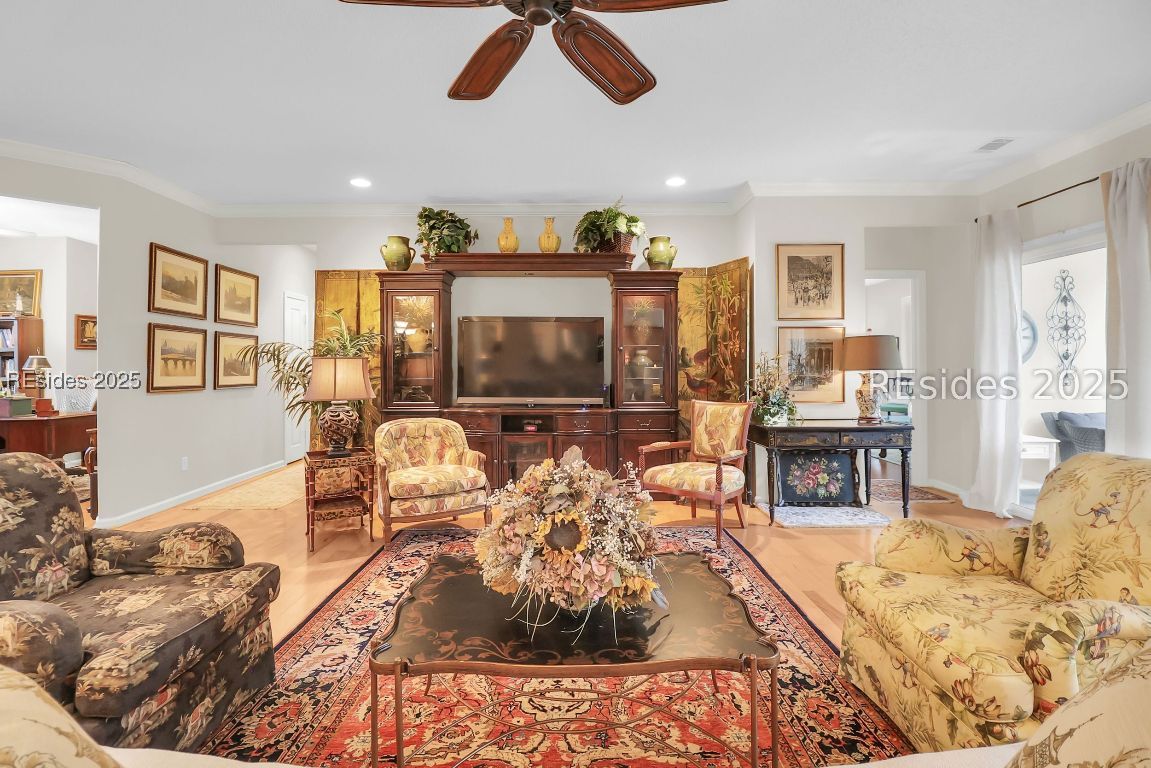 This popular Dogwood floor plan is situated on a spacious lot with a wooded backdrop, conveniently located near the Hidden Cypress Clubhouse amenities. The inviting brick paver walkway leads to a welcoming etched glass front door with a sidelight, opening into an entry foyer adorned with crown molding, chair rail, and 18" tile flooring. The Great Room, featuring crown molding, recessed lights, and wood floors, includes a formal dining area as well. The eat-in kitchen boasts a bay window where you can enjoy your morning coffee while overlooking the serene backyard. Maple-colored cabinets, some with lower roll-outs, a tile backsplash, quartz countertops with a breakfast bar, prep island, and pantry complete the kitchen. Adjacent to the entry foyer, the den/office is equipped with a lighted ceiling fan, plantation shutters, and a nook which is perfect for a desk. A separate guest area offers added privacy with a full bath. The primary suite features a bay window, soaking tub, and dual vanities. Three sliders open to a screen porch and an extended tiled patio, ideal for relaxing and enjoying the beautifully landscaped yard. The laundry room, with abundant cabinetry and a washer and dryer, leads to the two-car garage, which includes pull-down attic access and a utility sink. This home is offered at a fabulous price and is located in the active adult community of Sun City Hilton Head.