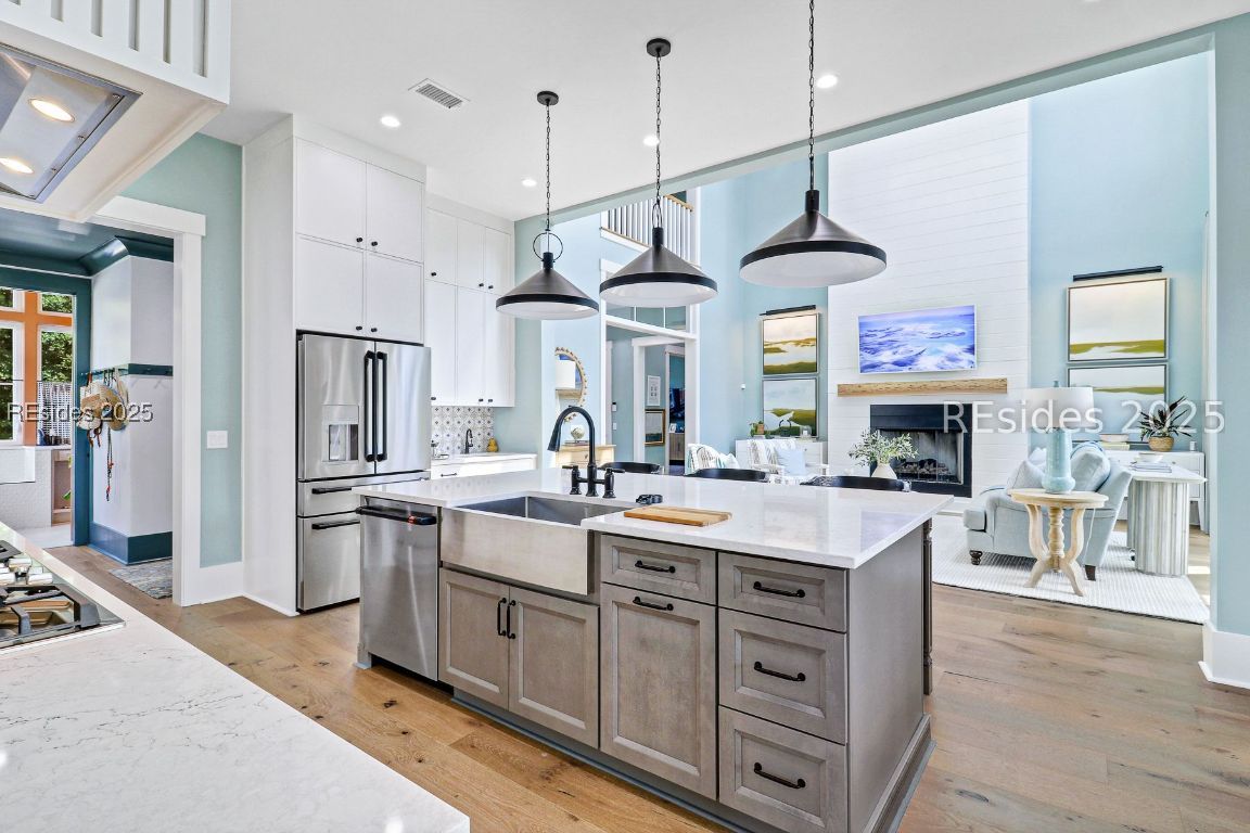 Introducing a stunning 3-bedroom, 3.5-bath estate that captures the essence of Lowcountry living with panoramic golf views and a design pedigree that turned heads on the national stage. Originally crafted for a widely celebrated televised design showcase, this home is the result of an elite collaboration between Court Atkins Group, Shoreline Construction, and acclaimed designer Brian Patrick Flynn. The result is a turn-key furnished home that feels inviting, luxurious, and utterly move-in ready, with professional interior décor and high-end finishes throughout. The Main level features a light-filled Great Room with soaring ceilings and an open-concept layout that seamlessly connects the living, dining, and gourmet kitchen areas. The kitchen boasts a large center island, full walk in pantry, prep area and scullery. Your pets will love the laundry room, complete with a pet spa and feeding station. Main level media room with pocket doors can double as a home office. The Primary Suite is on point with double walk-in closets, free standing tub and a gorgeous walk-in shower. Upstairs you'll find 2 guest suites and the Loft Lounge area, fully equipped with games to entertain all ages. Overlooking the 10th fairway of Berkeley Halls North Course, the most remarkable outdoor oasis awaits- with covered porches, an open saltwater pool with an automatic cover, wood burning fireplace, an outdoor kitchen with grill, cooktop, smoker & pizza oven and outdoor dining pergola- an entertainer's delight. A 2.5 car garage with epoxy floors and fully decorated comes with a Murphy golf simulator and 4 seat ICON golf cart! Sold fully furnished- you don't even need to bring the toothbrush- it's already there!