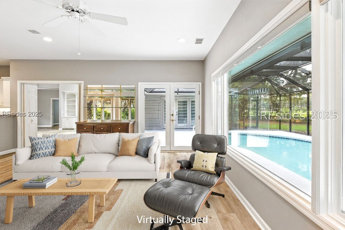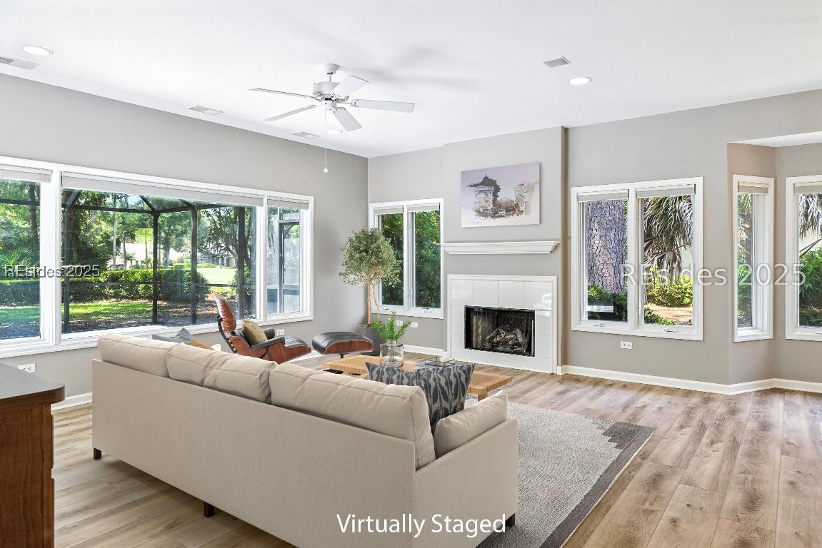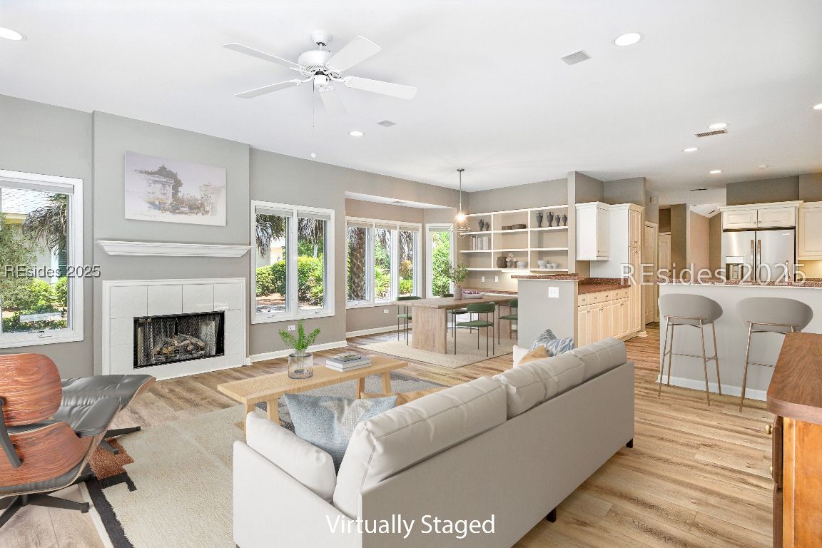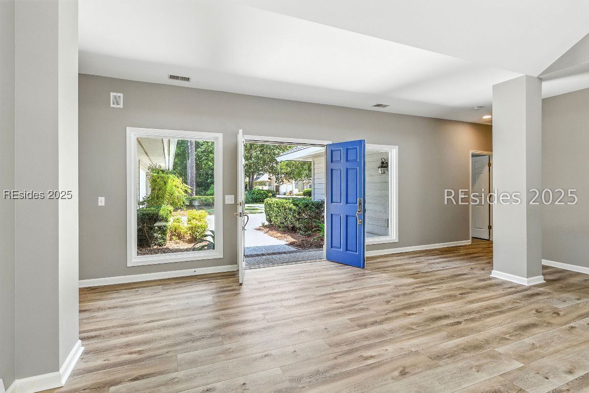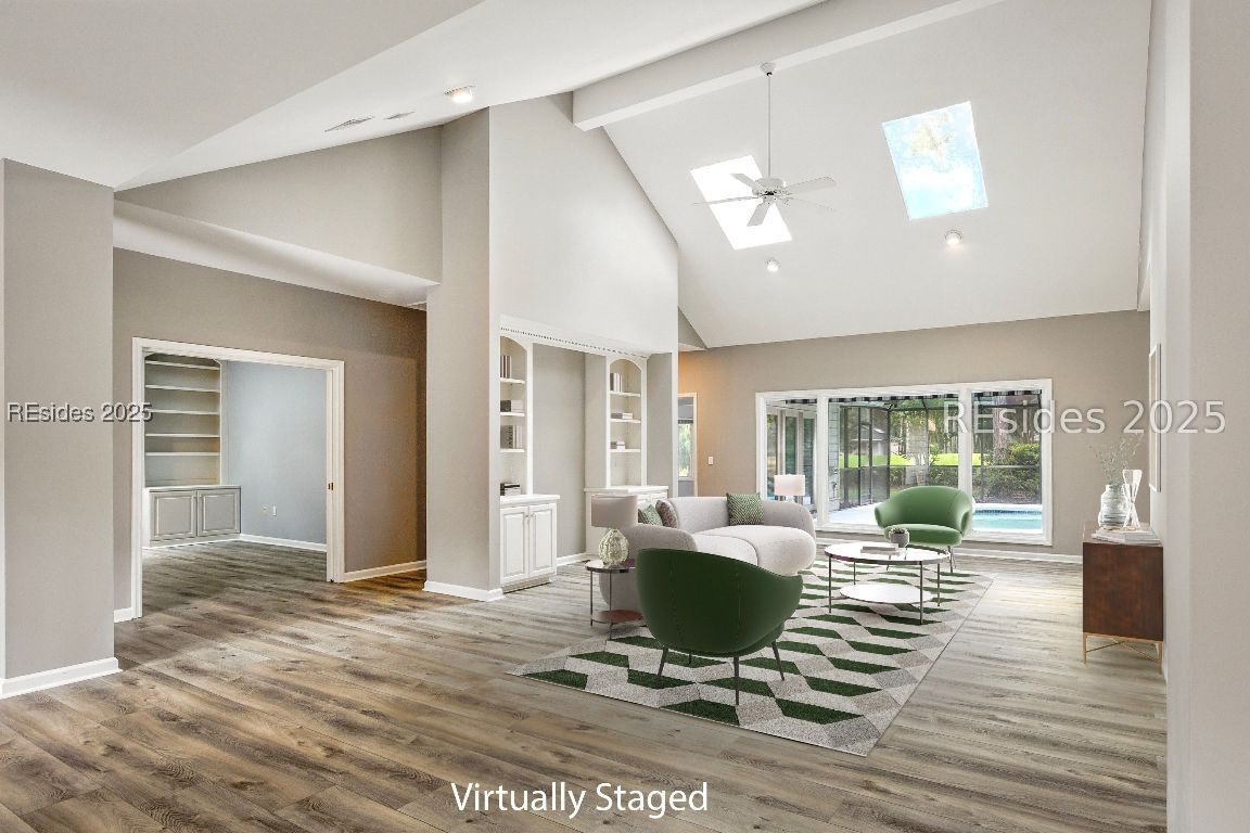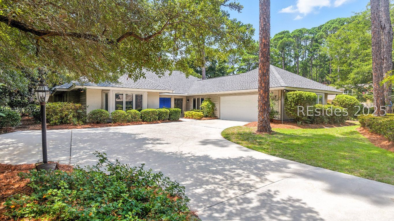 Welcome to this charming 3-bed, 2.5-bath home in the Indigo Run community. Thoughtfully designed with a single-level layout, this home offers an open floor plan that lives larger than its footprint. High ceilings in the living room create an airy, inviting space, while abundant natural light pours in through large windows and skylights. The kitchen offers ample cabinet space, a convenient breakfast area, a built-in desk, and a seamless transition into the cozy family room. You'll find generous closet space throughout, a spacious laundry room, and a 2 car garage that adds to the home's everyday functionality. Step outside to your private screened pool area, overlooking the golf course ideal for year-round outdoor living and entertaining. Indigo Run is one of Hilton Head's gated communities, known for its natural beauty, convenient location, and exceptional amenities. Residents benefit from 24-hour security and two convenient gates for owners and guests. Social and golf memberships are optional, offering flexibility for a range of lifestyles. Whether you're seeking a comfortable one-level residence or a low-maintenance retreat, this home offers comfort, style, and excellent potential.