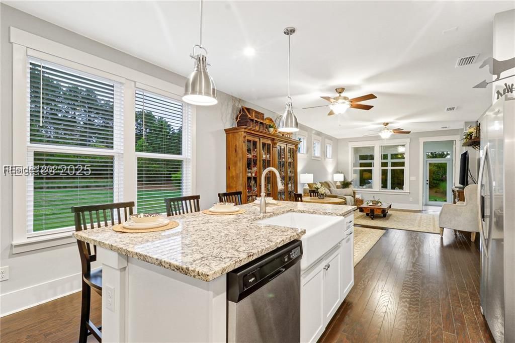 Experience refined Lowcountry living in this stunning Hallmark model, perfectly situated on an expansive cul-de-sac lot in Sun City North. The oversized lot provides extra space, privacy, and beautiful curb appeal rarely found in the community. Relax year-round in the newly added four-season room with peaceful lagoon and wooded views. Inside, the open-concept design showcases rich hardwood floors, a chef-inspired kitchen with stainless steel appliances, designer tile backsplash, and a spacious pantry. Offering 3 bedrooms and 2 bathrooms, this thoughtfully designed home blends comfort, style, and convenience, perfect for enjoying the Sun City lifestyle!