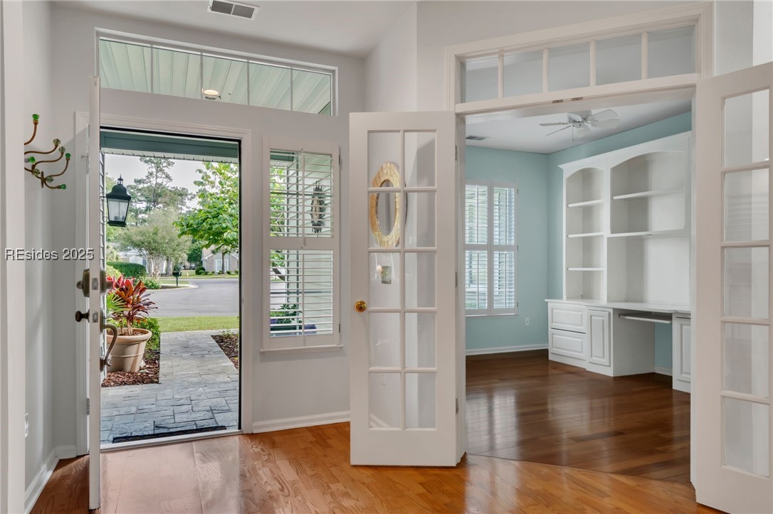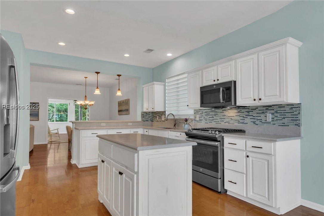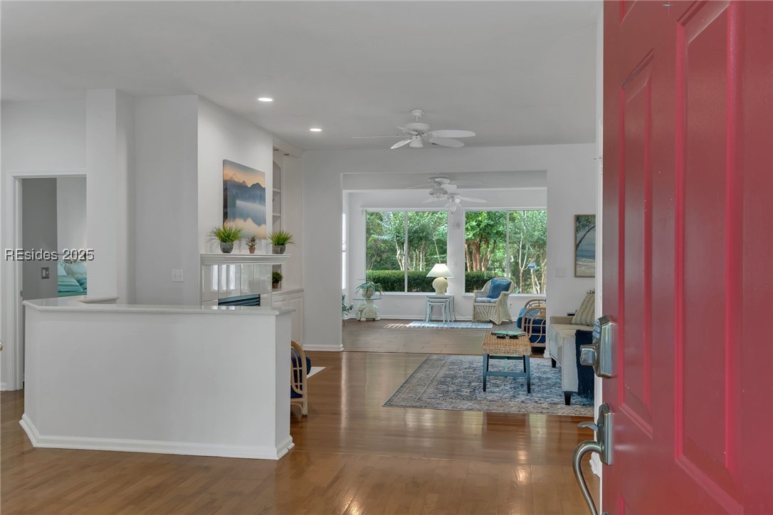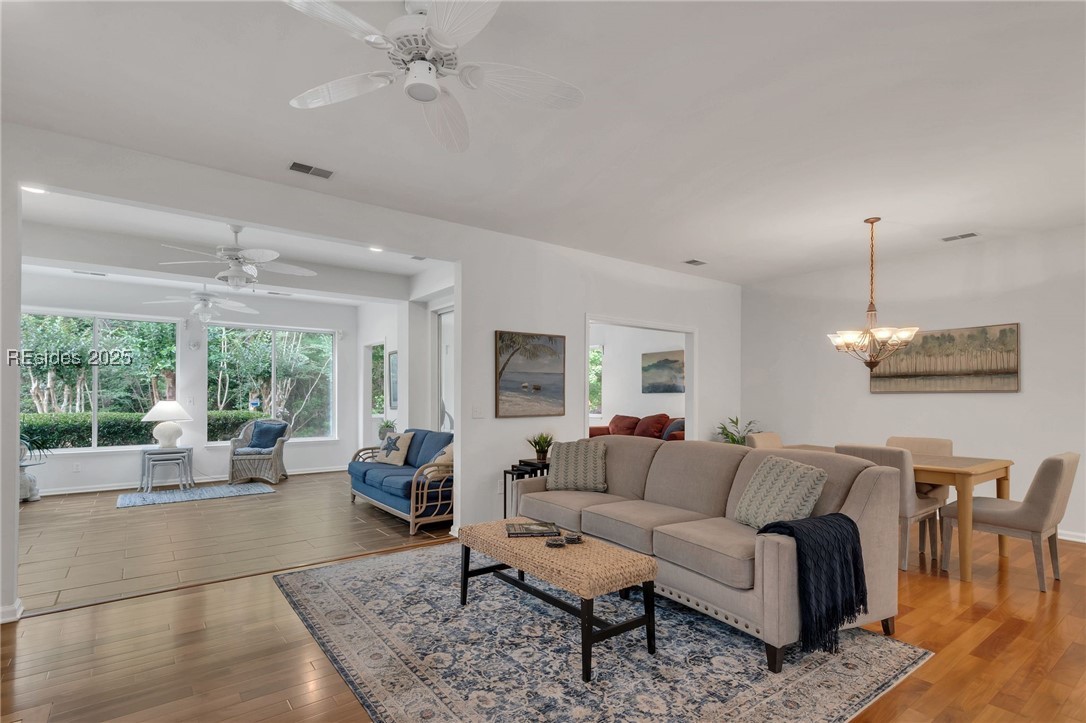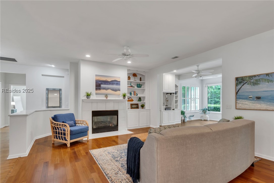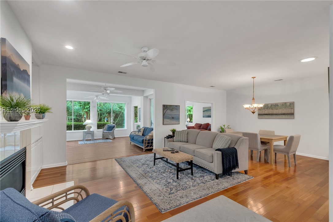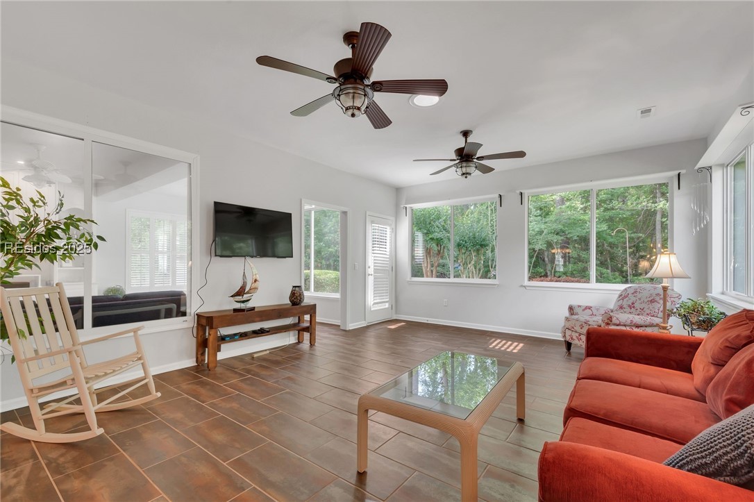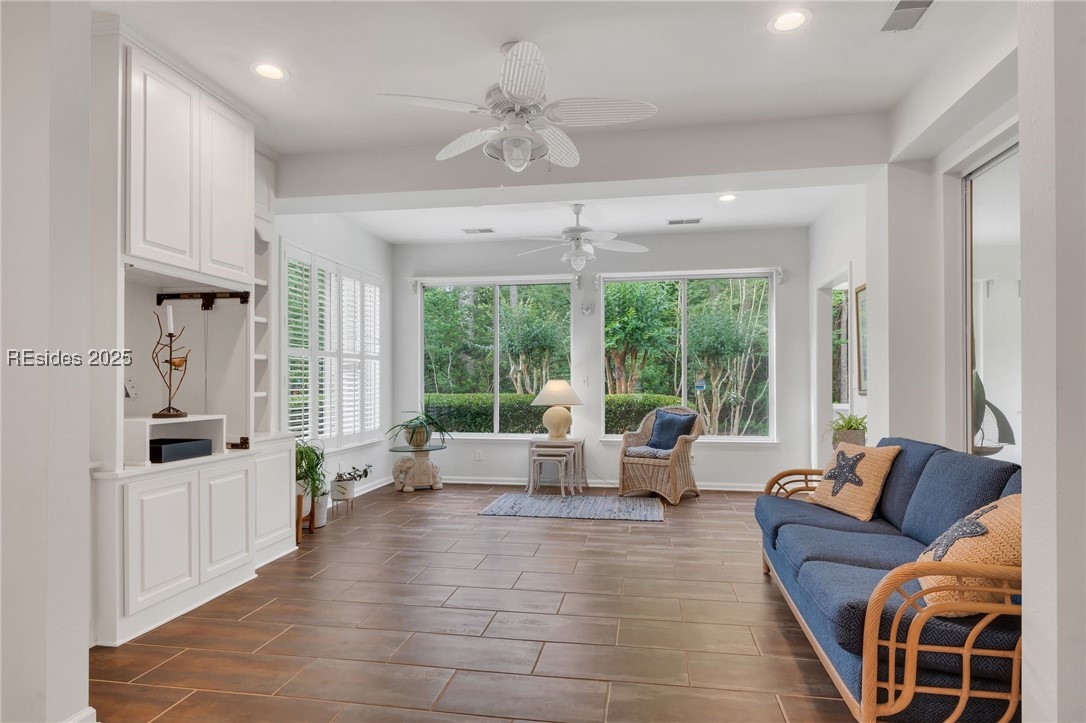 Tucked away at the end of a quiet cul-de-sac, this home offers exceptional privacy in Sun City Hilton Head. Custom 2,534 sq ft Augusta Revere with 2BR, 2BA, Den with French doors and built-ins, and 2 Carolina Rooms. Oversized eat-in kitchen with gas slide-in range, stainless appliances, quartz counters, cabinet pullouts, and bay window. Great Room with gas fireplace and built-ins. Primary suite with bay window, updated bath with tiled walk-in shower and tub. Updated guest bath with Corian shower. No carpet, plantation shutters, 3 solar tubes, tankless water heater. Polybutylene replaced with PEX. Spacious yard backs to beautiful woodlands.