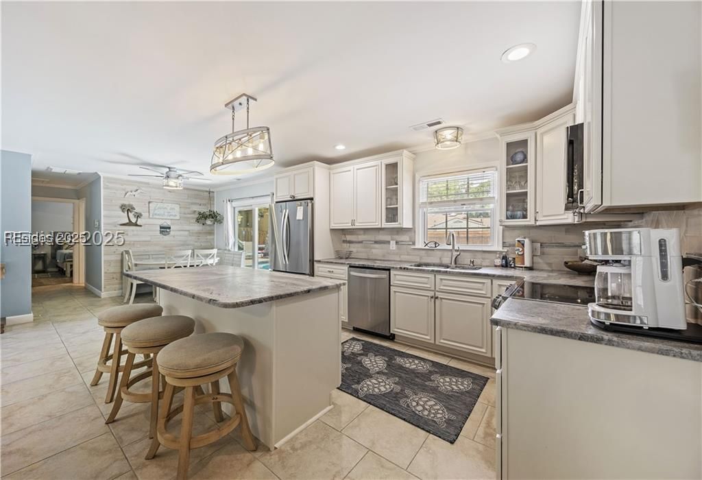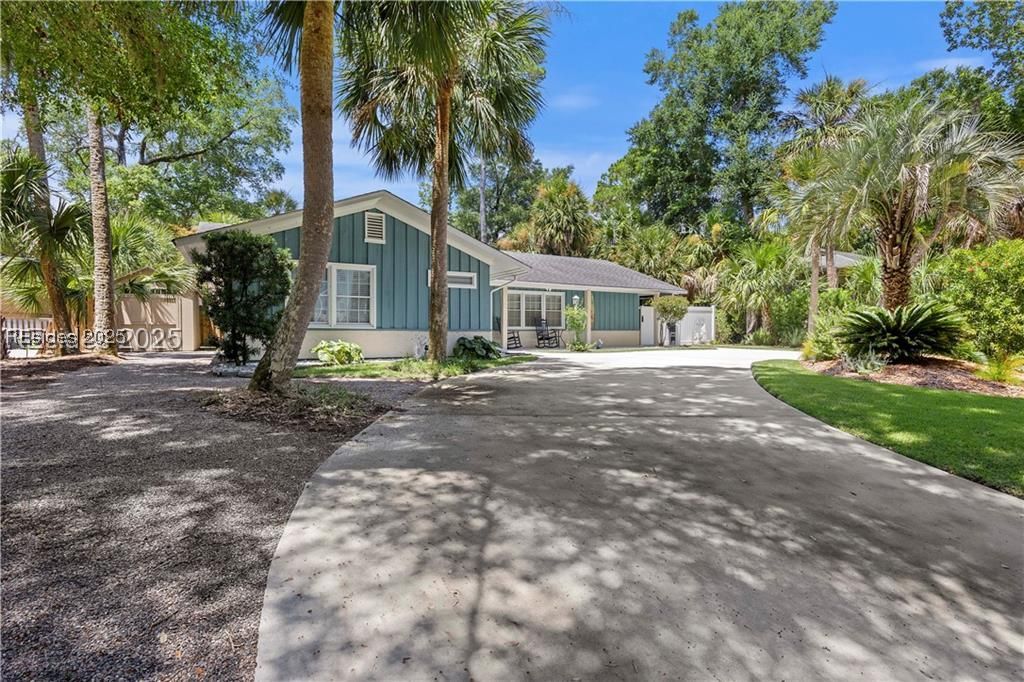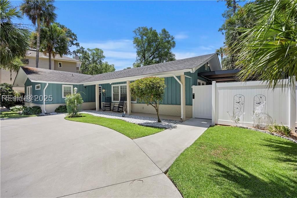 This turn-key renovated beautiful home is close to the beach. Pride in ownership shows. Great for your own retreat and/or a rental investment! The kitchen w/ss appliances and center island is open to the spacious living area w/a cozy fireplace. The primary bedroom is generous in size & ensuite. The other two bedrooms can accommodate 6 guests. Step outside to your private fenced oasis, with oversized pool, spa, putting green, cornhole, hammock, grilling, outdoor shower.... Ideal for entertaining or unwinding after a day at the beach. A short walk to restaurants, grocery, beach and Coligny Plaza. No POA or HOA fees! Make this home yours.